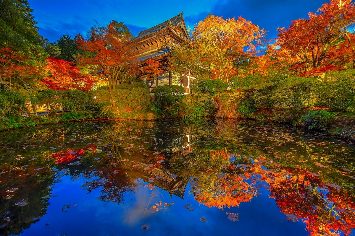 池から眺めた薄暮時間のライトアップされた仏殿の様子です。