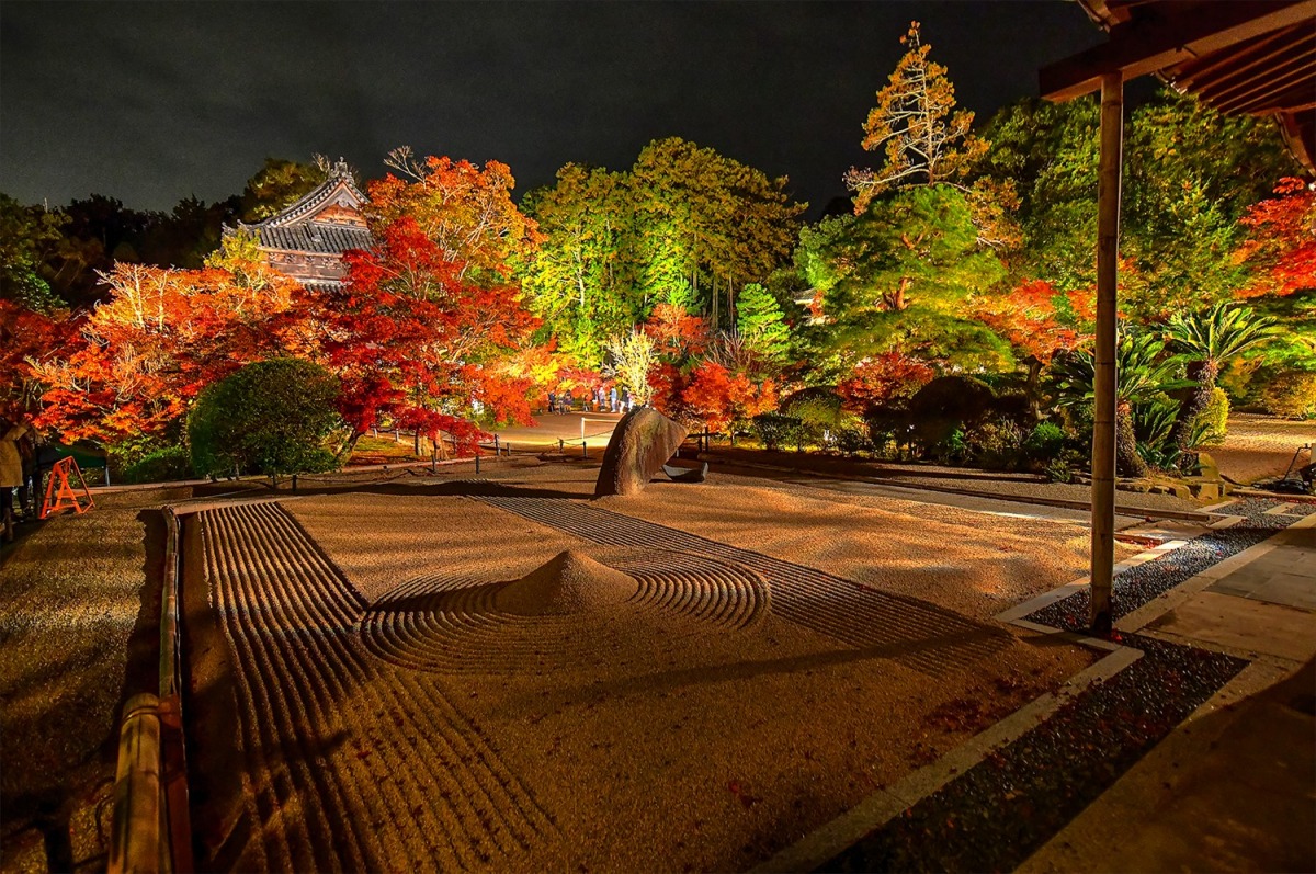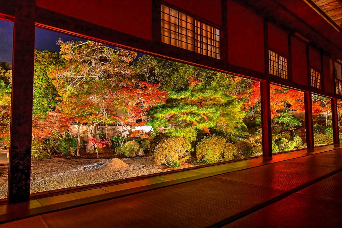 方丈の中から眺めた、ライトアップされたお庭の様子です。方丈や禅堂で座禅体験ができます。