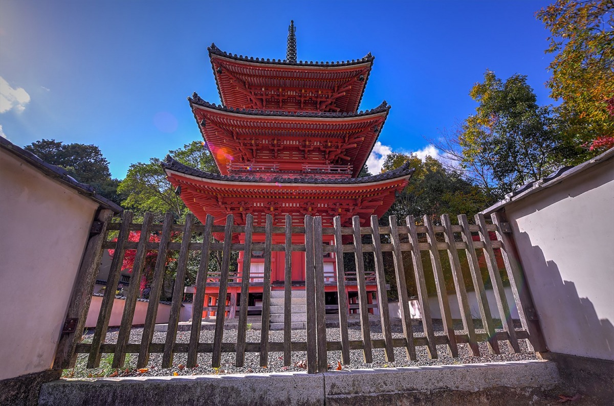 境内にある三重塔は、南北朝時代の永和2(1376)年に建てられたもので、岡山県下では、弘安8(1285)年に建てられた美作市の長福寺の塔に次いで2番目に古い塔です。宝福寺の中でも、戦国時代の戦火を免れ残っている唯一の建物です。本瓦葺、丹塗りの三重塔で、各重のバランスも良い名塔です。