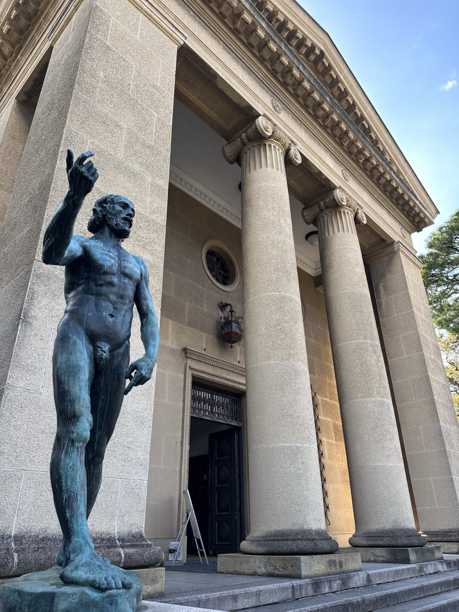 倉敷美観地区の町並みの中で目を引く、パルテノン神殿風の外観が特徴的な「大原美術館」。