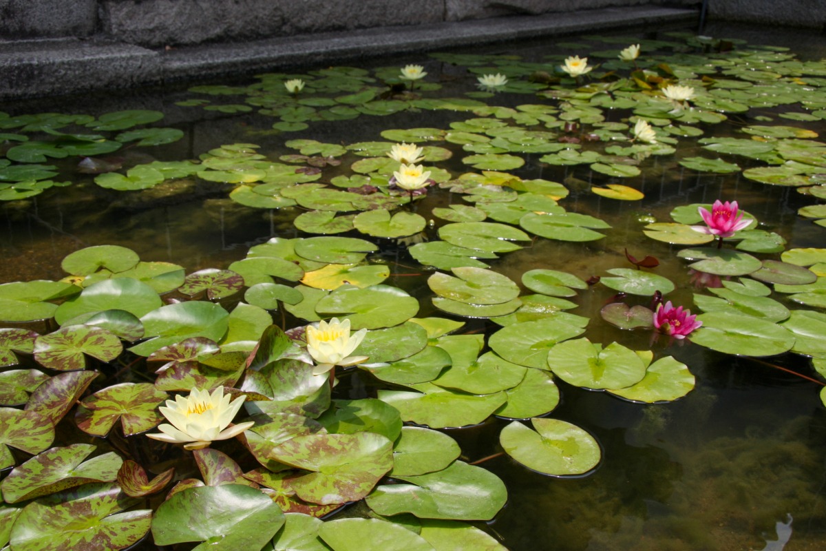 中庭では毎年6月から10月頃まで、美術館の収蔵作品であるクロード・モネの「睡蓮」ゆかりの花を見ることができます。なんと、フランス・ジヴェルニーのモネの自宅の庭より2000年に株分けされた睡蓮です。