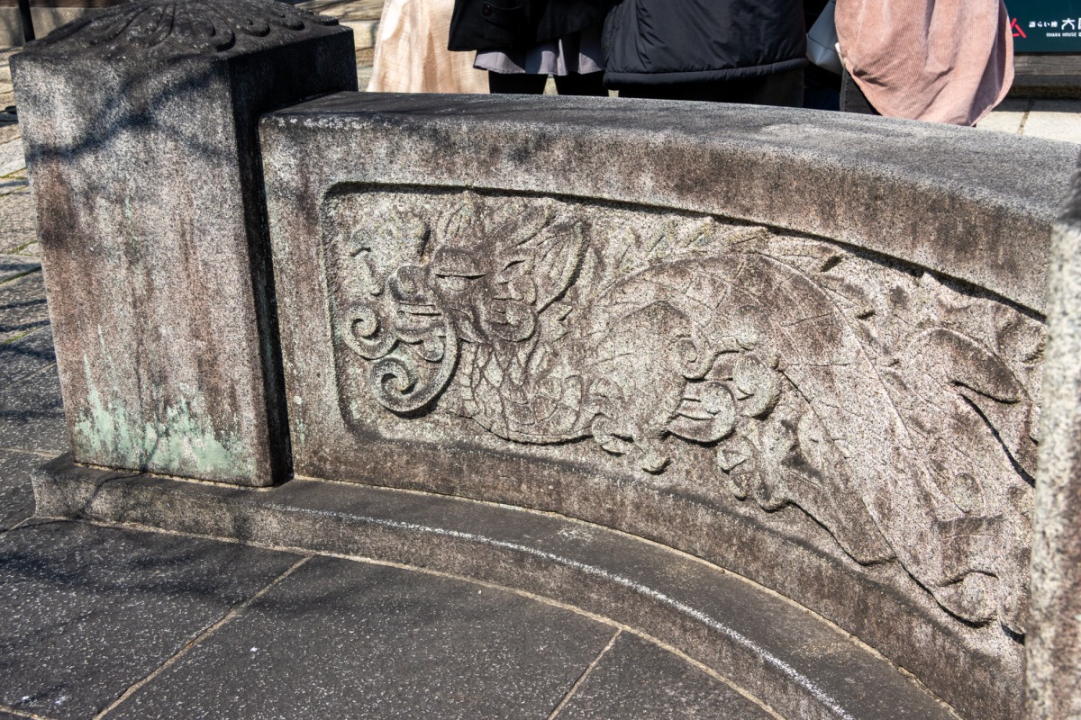 橋の欄干に彫られた龍のレリーフは、児島虎次郎のデザインによるものです。