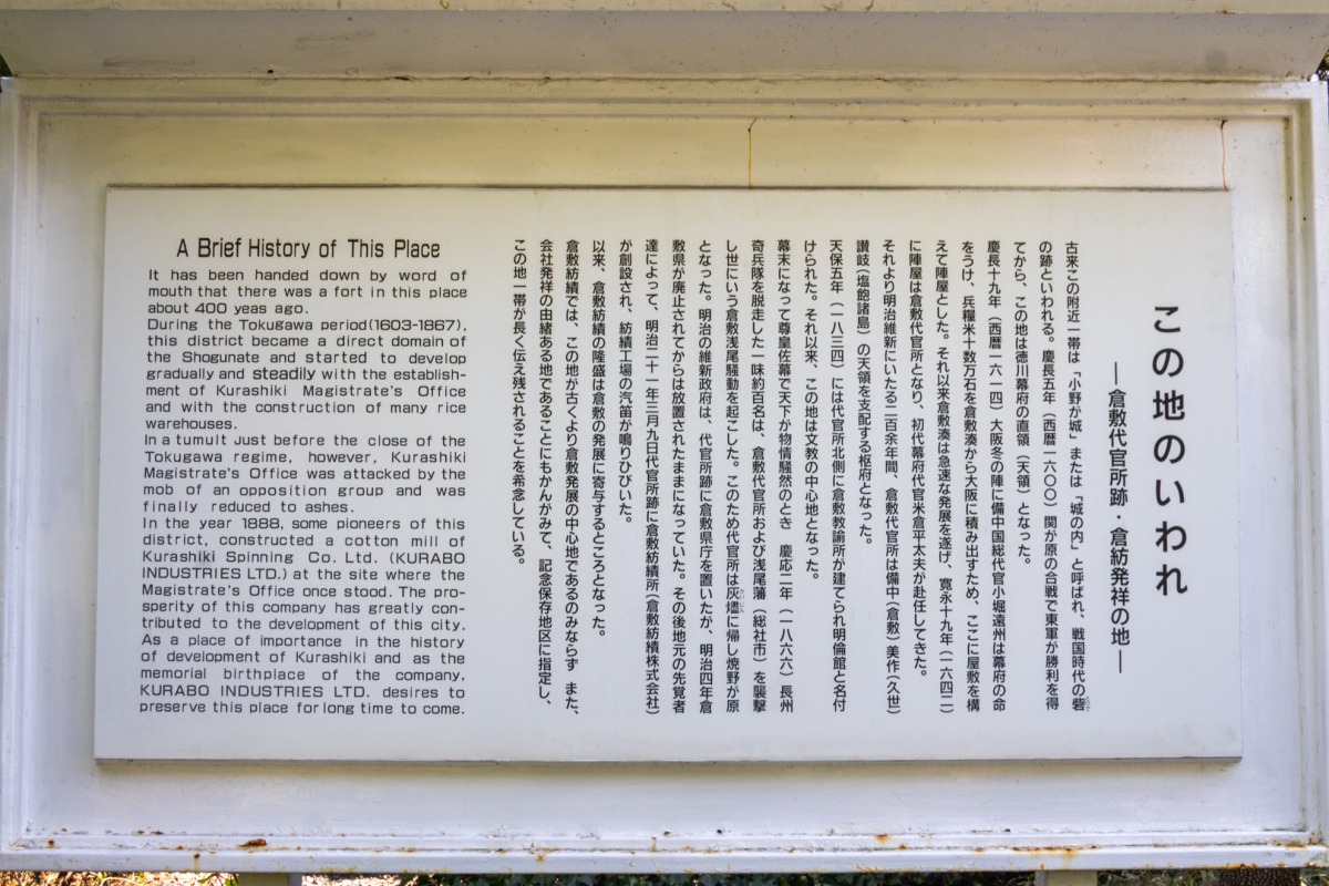 倉敷川のほとりを歩いていると、石のベンチとともに「倉紡製品原綿積み降ろし場跡」と書かれた石碑を見つけました。