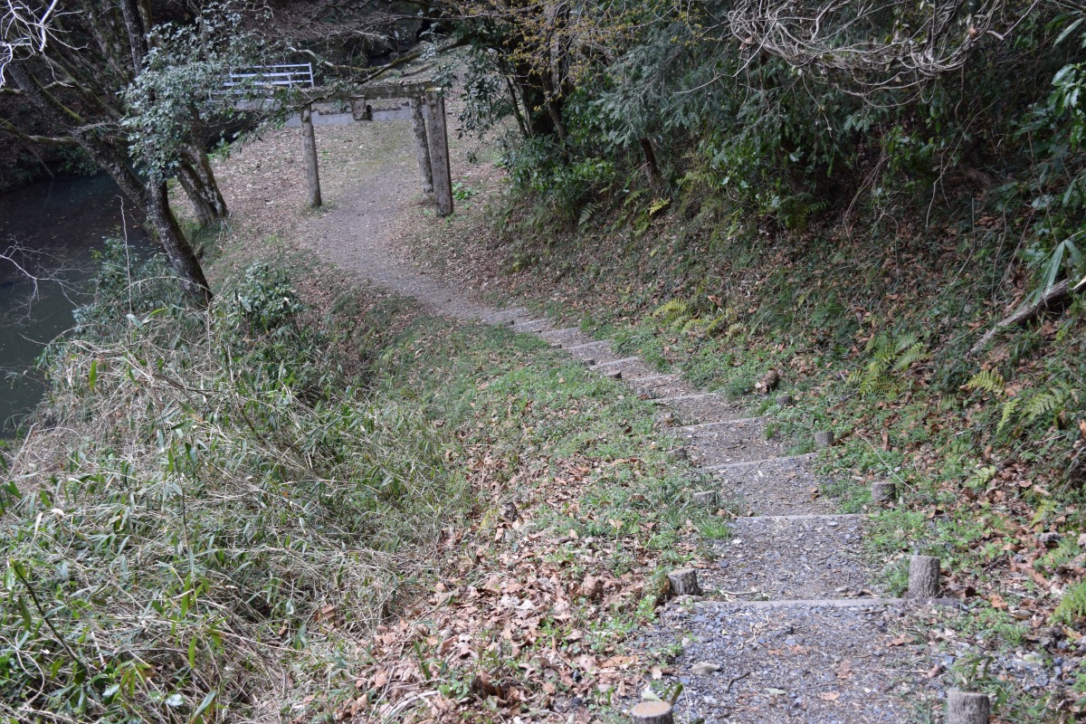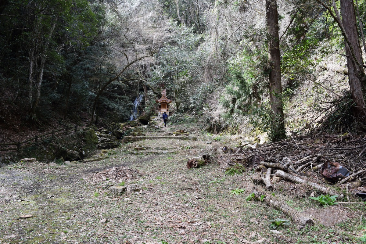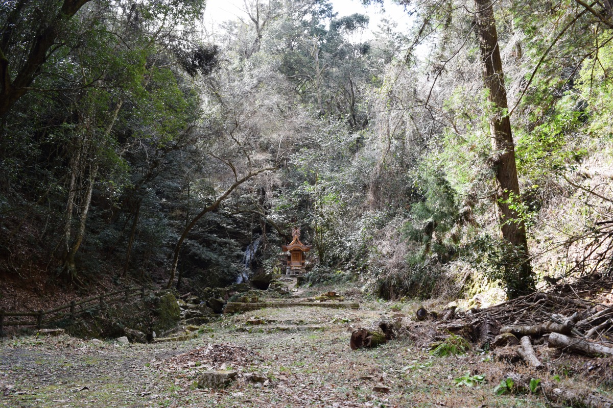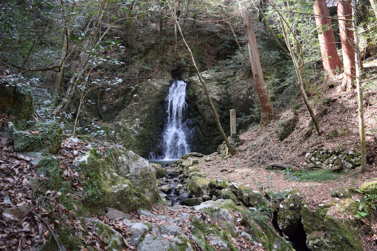 まずは、赤磐市是里にある「血洗の滝(ちあらいのたき)」と「血洗滝神社(ちあらいのたきじんじゃ)」を訪れてみます。駐車場に車を停めてから10分ほど歩くと階段があり、下りた先に滝と神社があります。