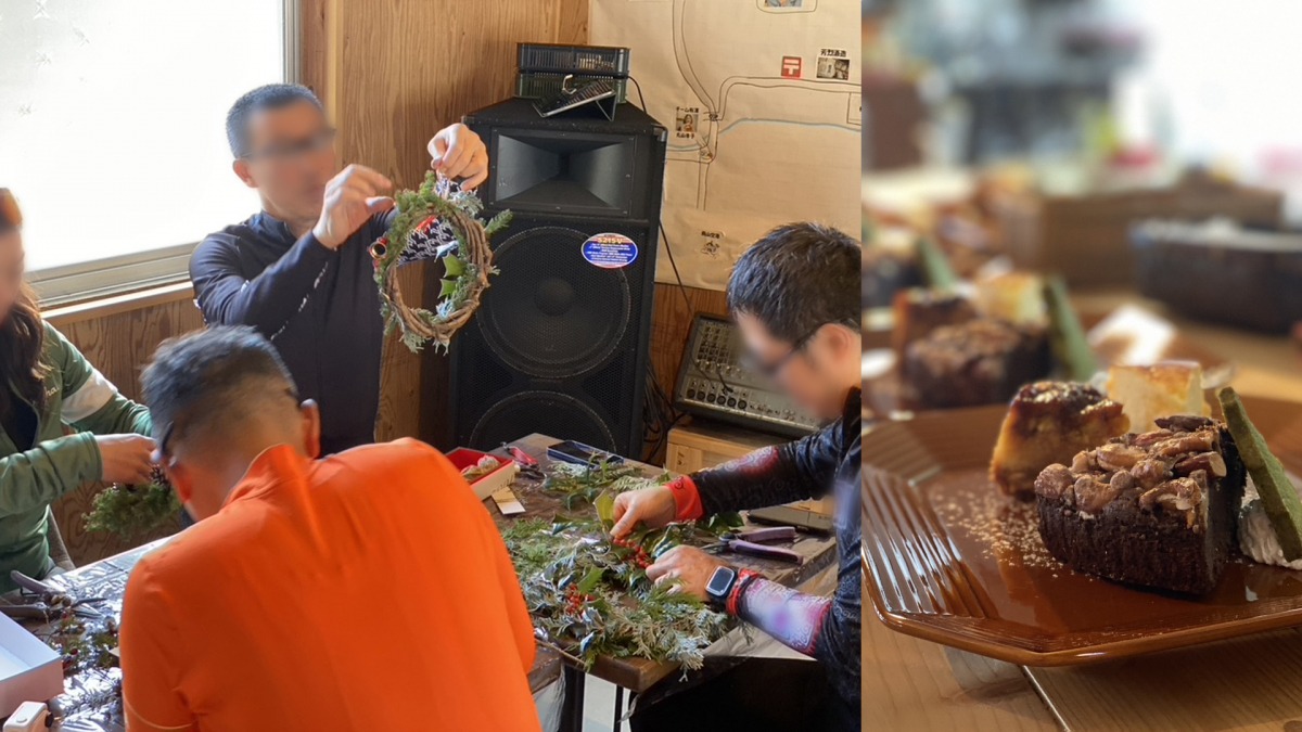 毎年12月に行われる「その辺のものでクリスマスリースづくり&暖かく甘い時間」では、材料に決まりがない、まさにその辺にあるものでオリジナルのリースを作り、スタッフ手づくりのお菓子を楽しんでいます。