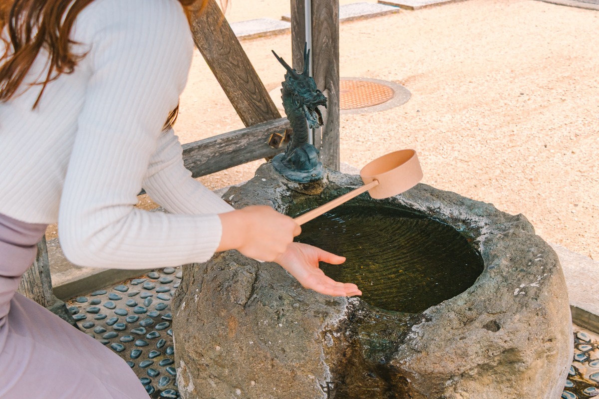 ③再び柄杓を右手に持ち、左手に水をためて口をすすぎます。すすぎ終わったら、音を立てずに静かに水を元の場所に戻すか、手で覆いながら下に流します。