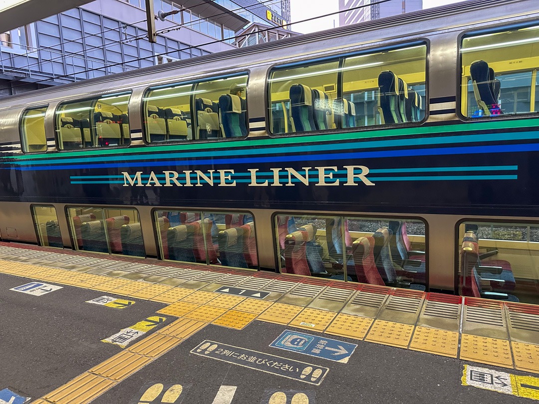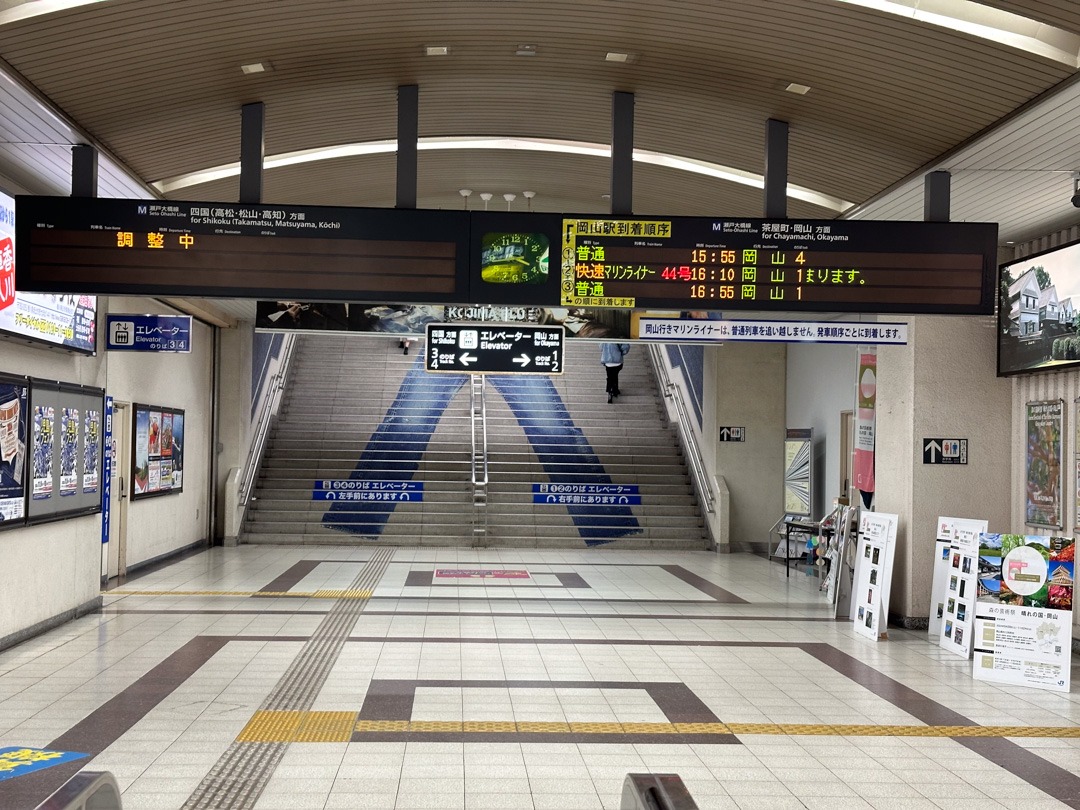 時間帯によってはJR宇野駅までの直通列車もありますが、基本的にはJR茶屋町駅まで「快速マリンライナー」にて移動、そこでJR宇野駅行きの普通列車に乗り換えます。JR茶屋町駅での乗り換えは、隣どうしのホームなので大きな荷物を持っていても安心です。時間帯にもよりますが、約1時間程度でJR宇野駅に到着します。