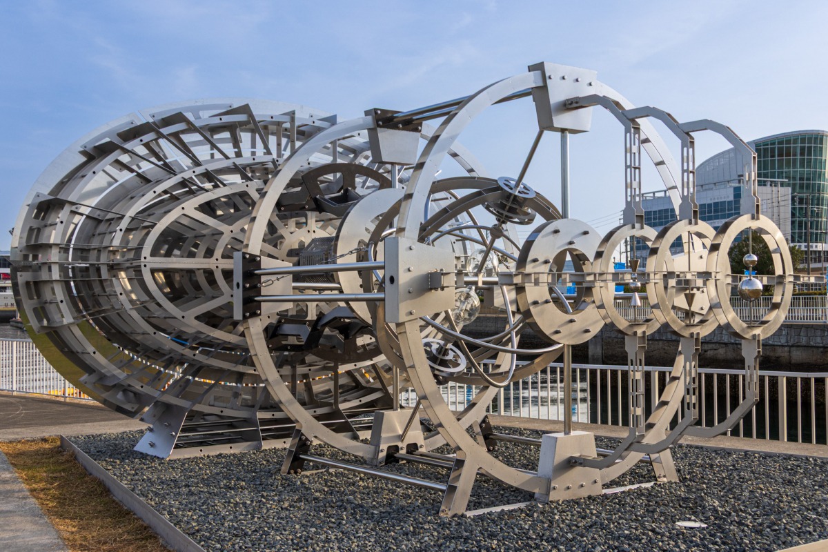 御影石の台座の上に乗った三日月状のオブジェは、船のようにみえますね。こちらの内部には海水が封じ込まれていて、作品自らに「海の記憶」を宿しています。
