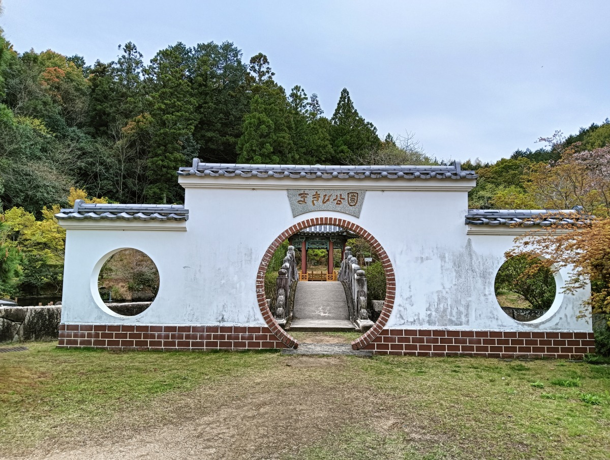 井原市の「鬼ヶ嶽」から走ること約15㎞、約1時間で、倉敷市にある「まきび公園」へ到着。こちらは地元出身の吉備真備公の記念碑が、中国西安市に建立されたのを記念して造られた古代中国風の公園です。
