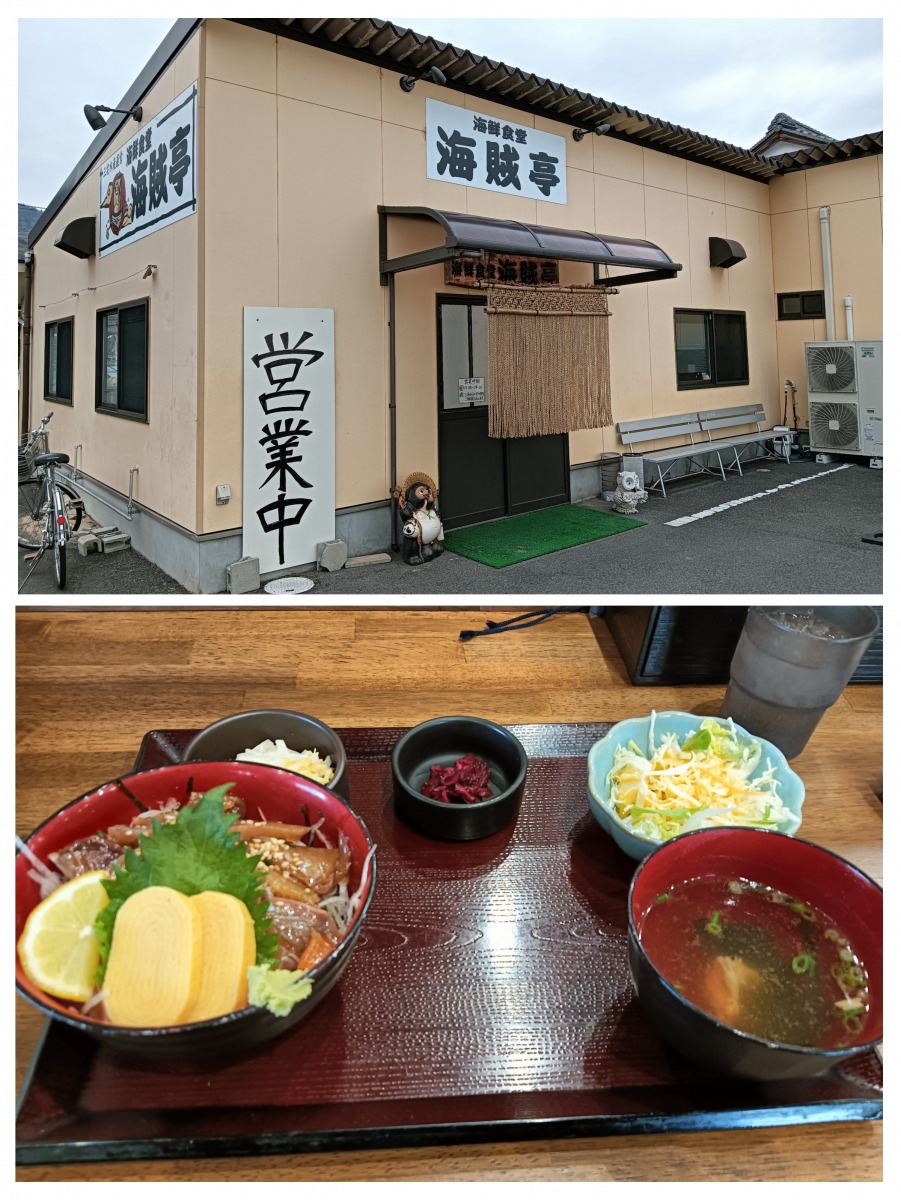 浅口市寄島町にある食事処「海賊亭」。寄島町で長年カキの養殖業を営む「三宅水産牡蠣直売所」の直営店で、新鮮な素材を使った定食や丼が人気のお店。私が訪れた際に食べたのは「まかない漬け丼」(1,200円)。新鮮なお刺身を熱々のご飯に乗せた満足ランチでした。