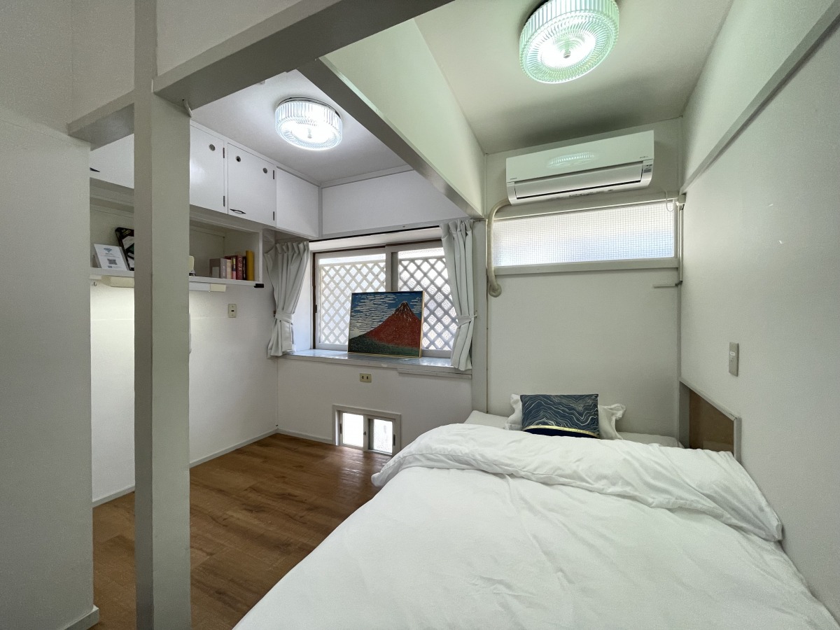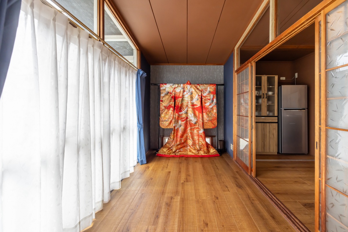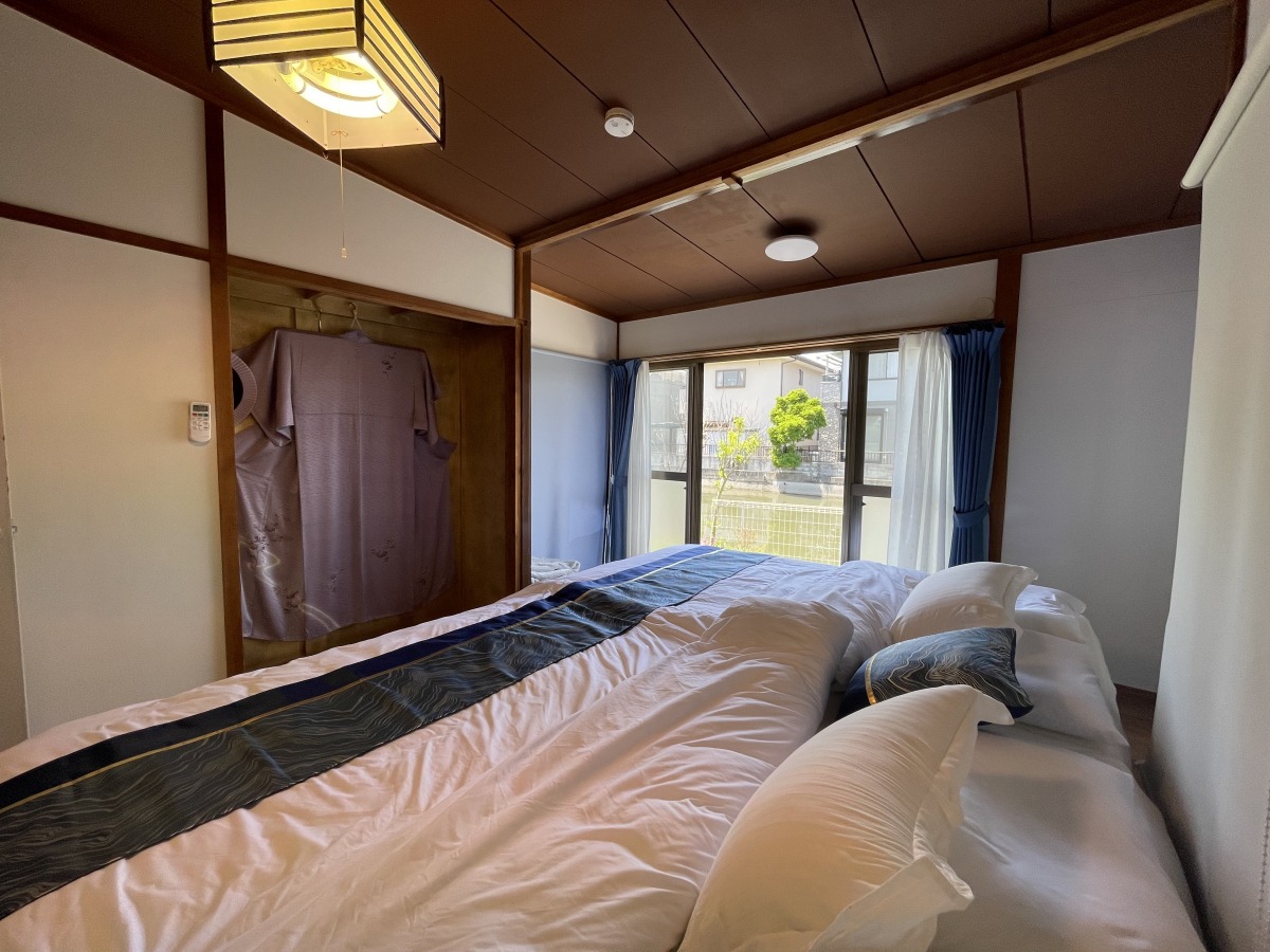 メインのベッドルームには、クイーンサイズ1台とセミダブル1台があります。お部屋からは庭瀬城跡のお堀を見ることができ、ゆったりとした静かな時間が流れています。薄紫の着物は、着物好きなオーナーの奥様の私物を飾っているそうです。