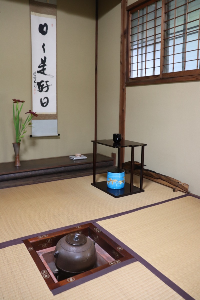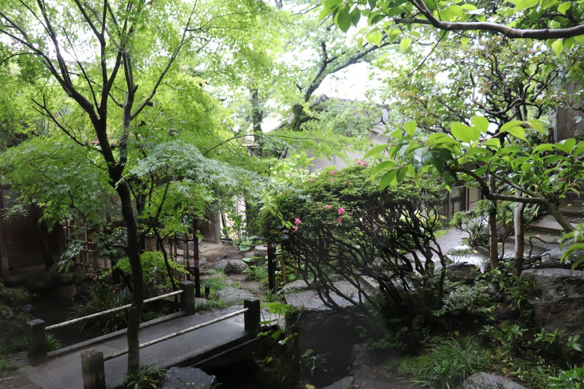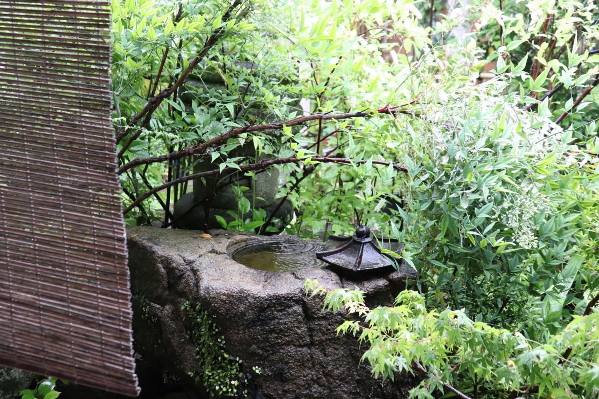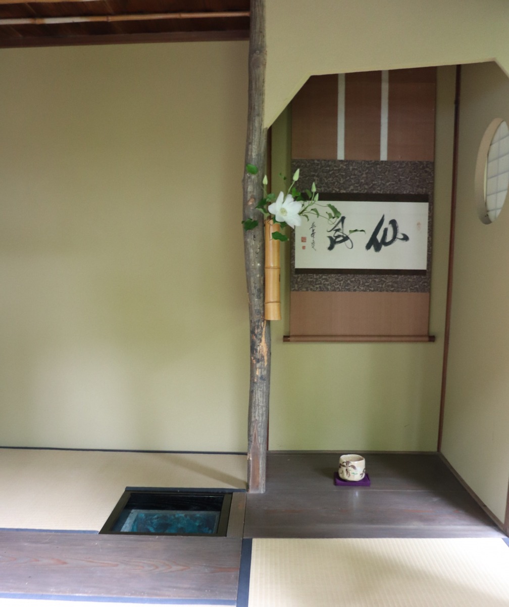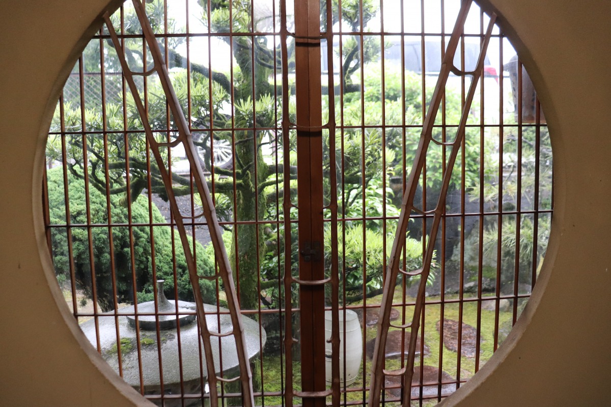 ランチを頂いたお部屋からの庭の新緑です。春には桜が咲き、秋には紅葉がきれいだそうです。また訪れてみたい素敵なところでした。新緑の奥に茶室(霧晴庵)があります。昭和初期に造られ、眺望は求めず、落ち着いた茶室で、4畳半の広さです。茶道口や外部の刀掛けなどがあり、茶道薮内流の流れを見ることができます。