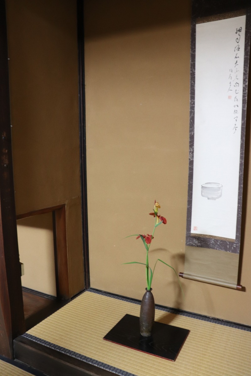 仙風閣(写真左側)の茶室の先に台目二畳の座敷がついています。床の下が高くなっていて庭の崖に迫りだすような形の二畳になっています。仙風閣でお茶を飲んだ後、招流閣(写真右側)にくると、庭と一体になった風流が味わえるそうです。