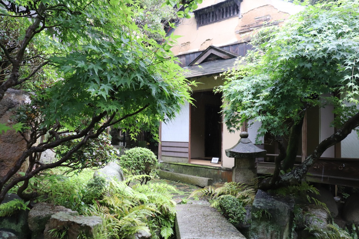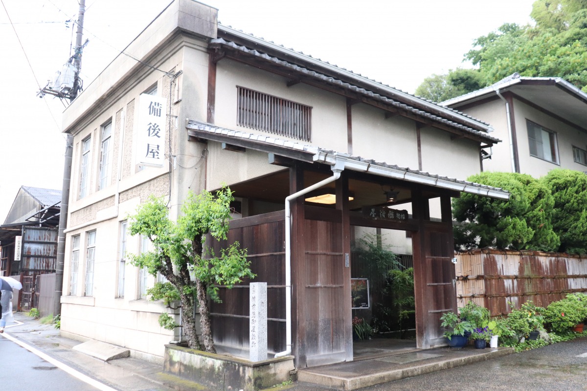 「備後屋」は大正3年から玉島港を訪れる人々の宿泊や食事の場として親しまれ、玉島の港町が見渡せる山の斜面に数寄屋造りの離れがあり、四季を通じて自然を感じるロケーションです。今回のツアーでは一番高台にある離れでランチを頂きました。