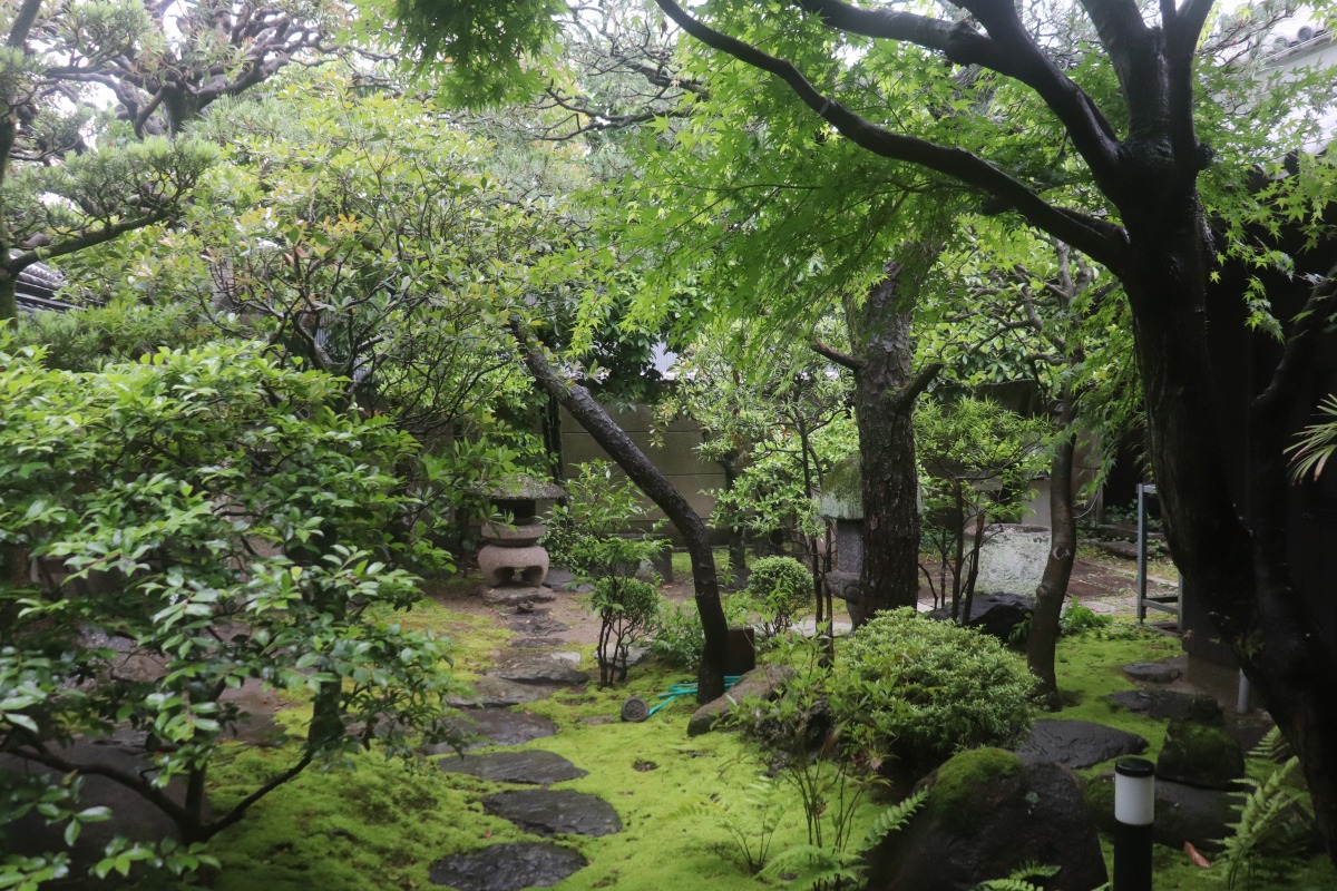 手入れの行き届いた広い庭園は、雨で苔もきれいな色をしていました。