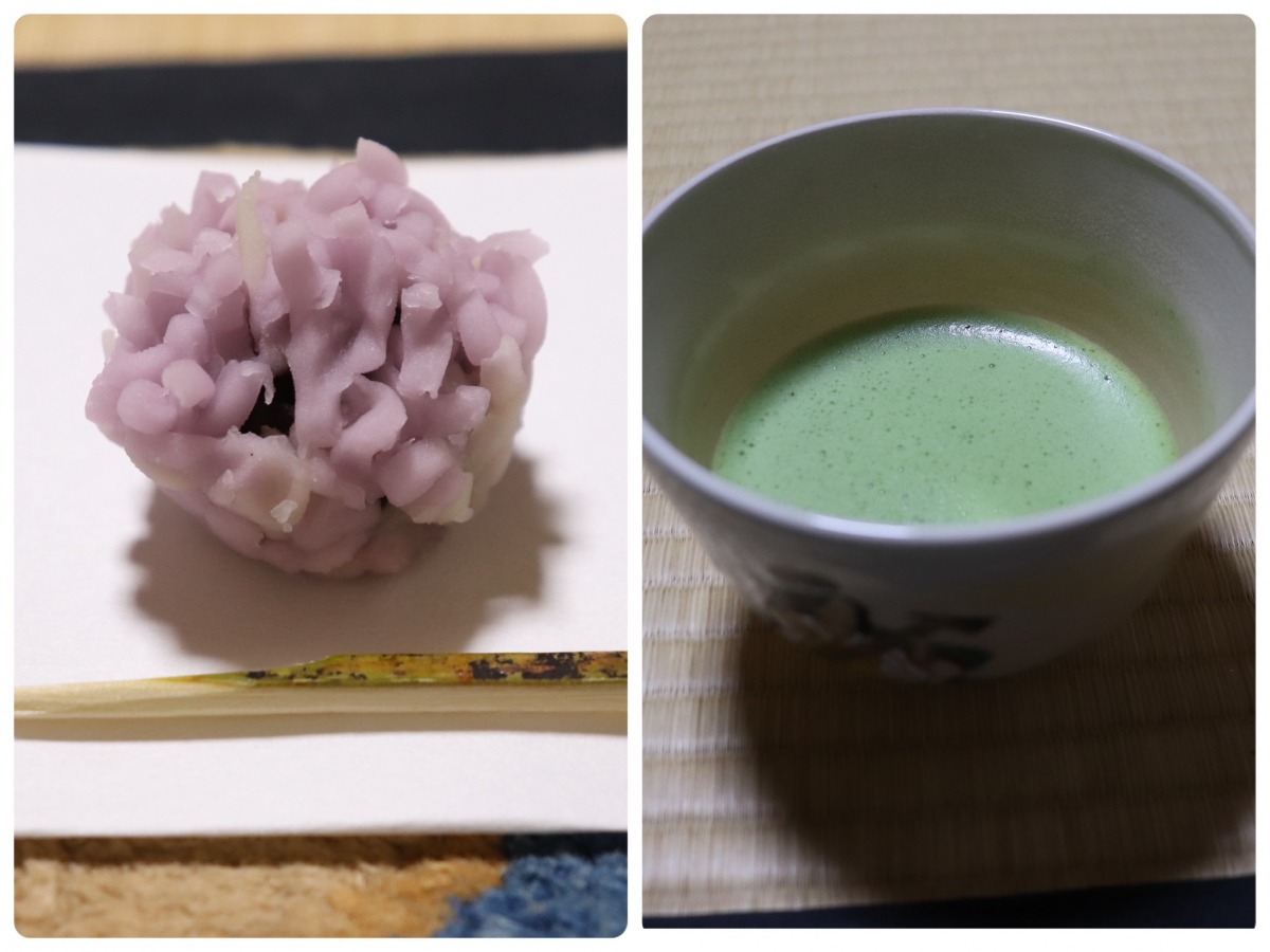お菓子は、玉島の老舗のお菓子屋さん「玉井堂」のアジサイをイメージしたお菓子。お庭のアジサイはまだ咲いていませんでしたが、季節を先取りして楽しむお茶の世界に触れていい時間が過ごせました。お抹茶も好みがありますが、苦みがなく美味しいお抹茶でした。