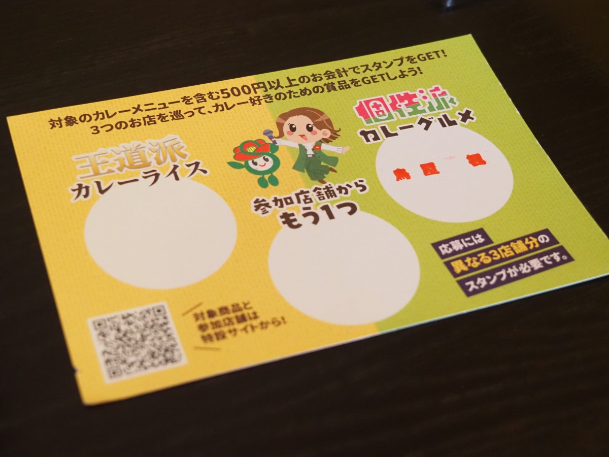 参加店舗で対象のカレーメニューを含む500円以上のお会計をすると、専用のスタンプ台紙がもらえます。この台紙が応募用紙を兼ねていますので、なくさないように要注意。
