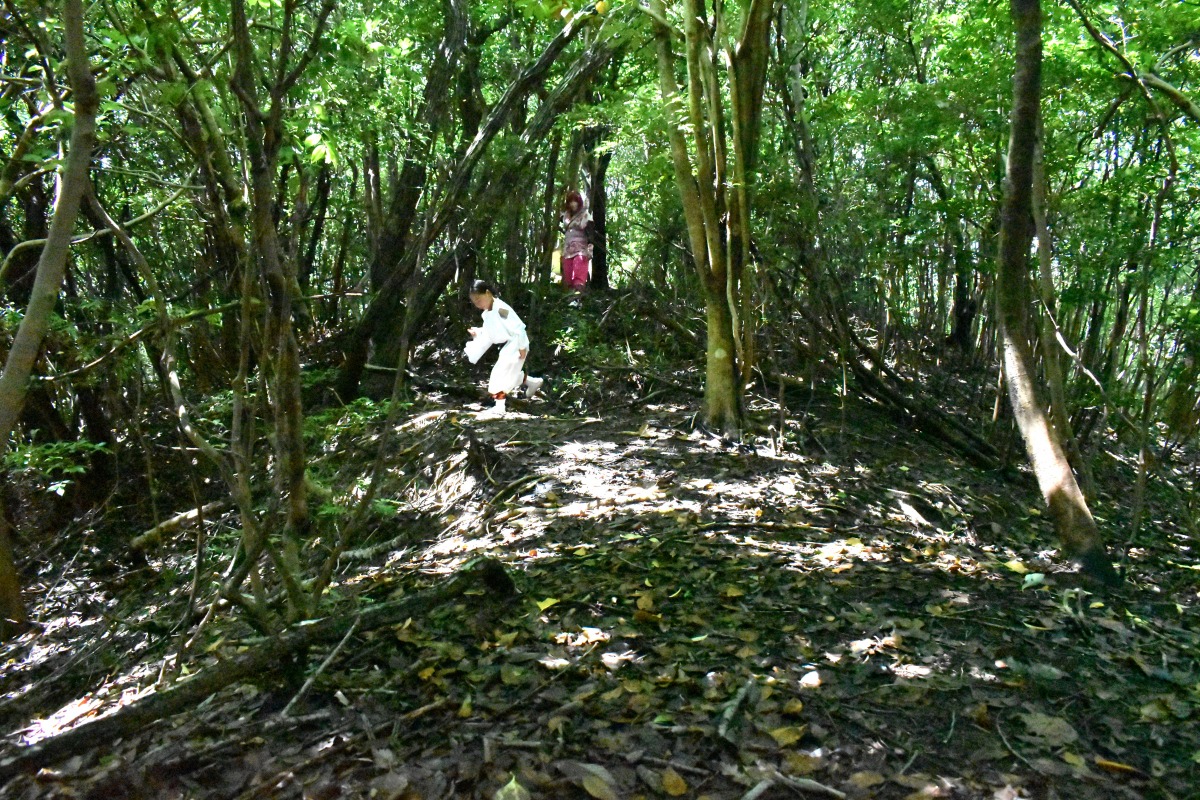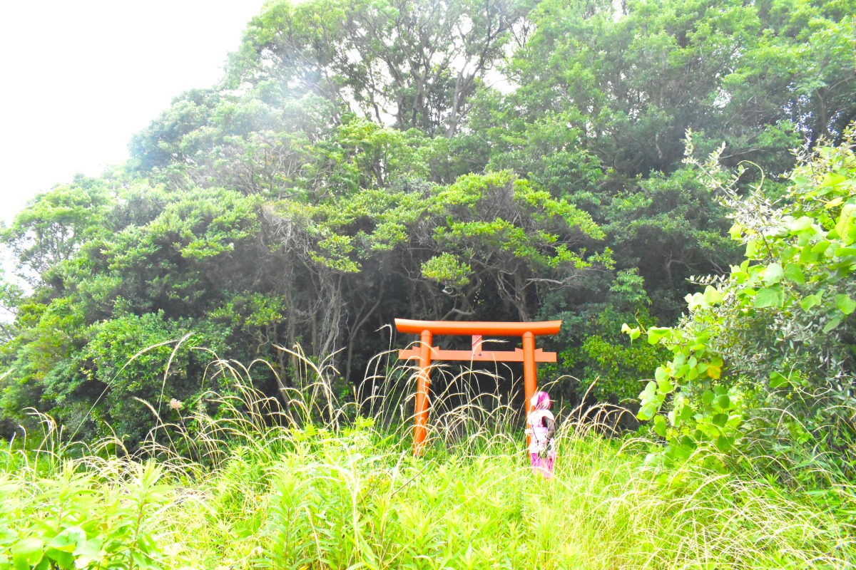 黒島1号墳の後円部北側には陪塚(ばいちょう・ばいづか)とみられる円墳の黒島2号墳があります。赤い鳥居をくぐらずに北側に向かうと、少し盛り上がった場所(頂部に小さな祠があるところ)があります。陪塚とは大型の古墳(主墳)に付随して築かれた小型の古墳を指します。主墳に埋葬された有力者(首長)の親族や、その臣下を埋葬するために築かれたと考えられています。県内でも珍しいものです。