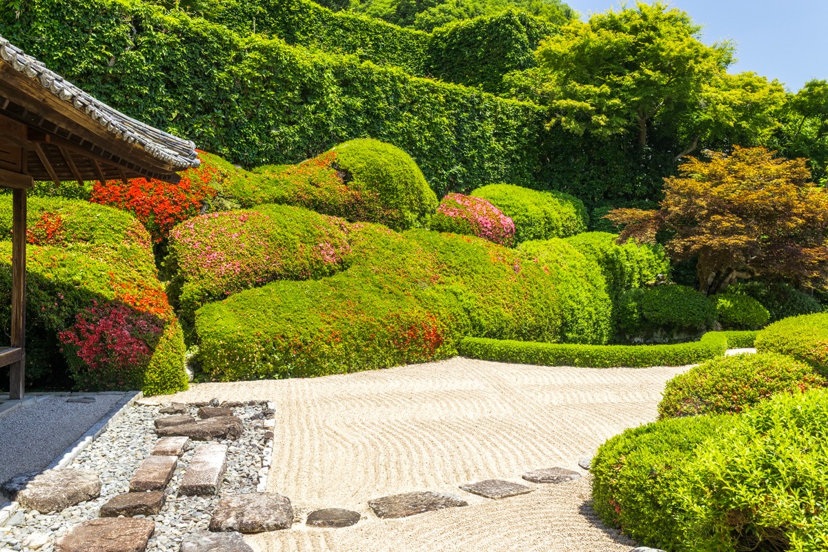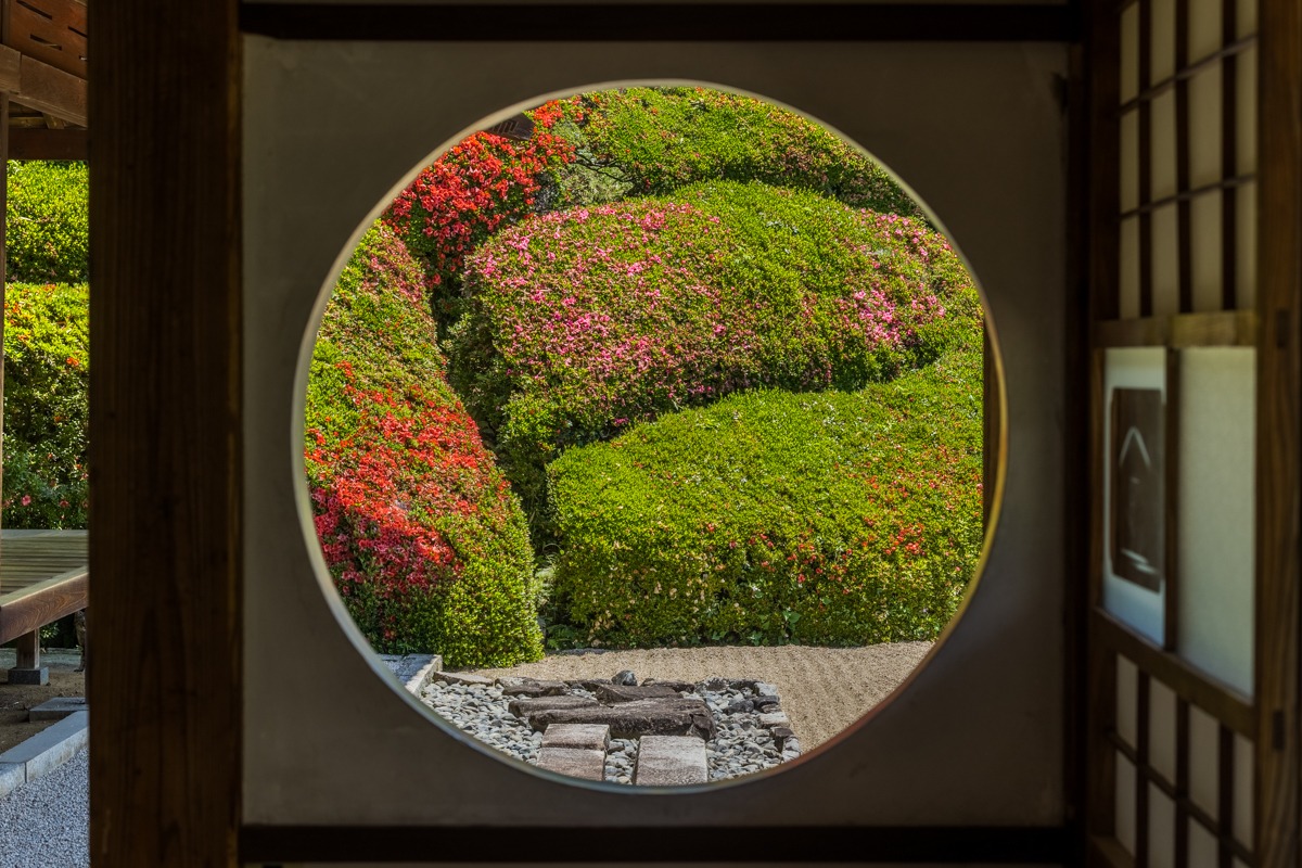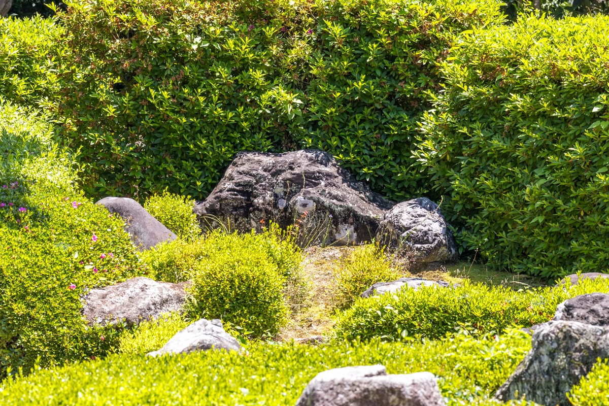 こちらは海の波を表した「青海波」と呼ばれるサツキの刈り込みです。幾重にも押し寄せる波の様子が見事に表現されており、この時期はピンクや赤の鮮やかな花が彩りを添えます。