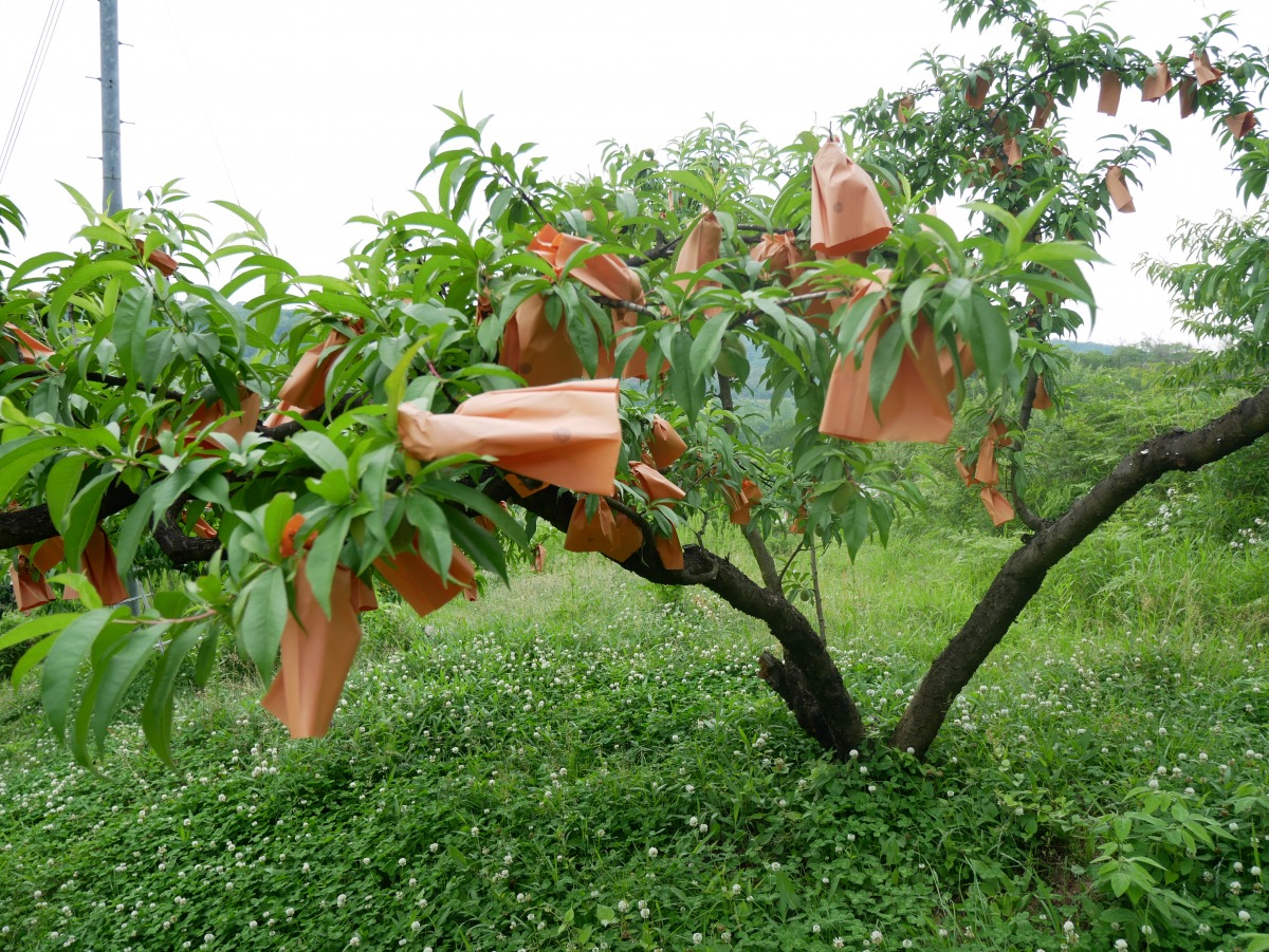 取材に訪れた6月上旬は、桃の袋がけに忙しい時期でした。剪定された桃の木にオレンジ色のカバーがかけられます。今年は123本、8種類の白桃を栽培。園内の白桃は7月上旬から10月下旬まで収穫が続きます。