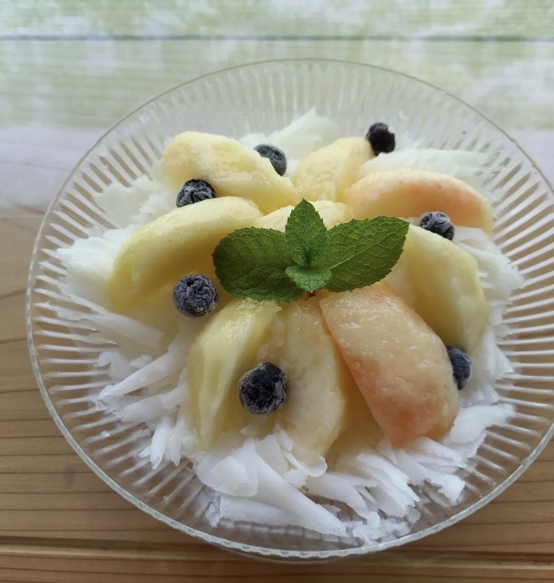園の拠点となるカフェ「Rich Fruits」は2018年にオープン。2025年は7月1日から8月上旬まで毎日営業します。里見さんが育てた白桃のかき氷やスムージーを楽しめます。ムスリムの旅行者も安心して楽しめるよう配慮した飲食店である「MUSLIM FRIENDLY」の認定も受けています。