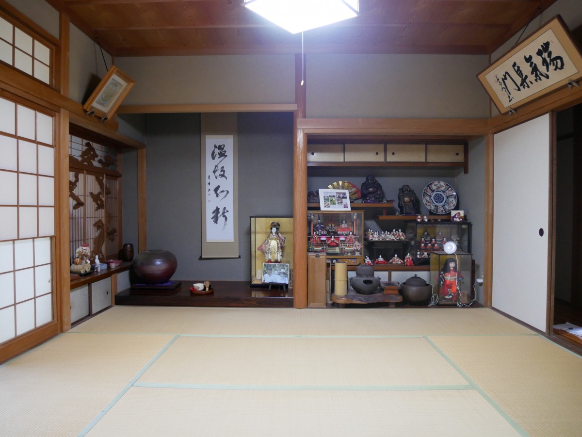 お庭は立派な日本庭園です。その奥に桃の木を見ることができます。ゲストハウスの1階はキッチン、ダイニング。2階は寝室、お風呂、トイレがあり、最大4名まで宿泊可能。日本の伝統的な和室の客間では、着付けや茶道体験でゲストをもてなしています。またカフェ同様、お肉やお魚は使わない、ベジタリアンの方にも優しい食事が提供されています。
