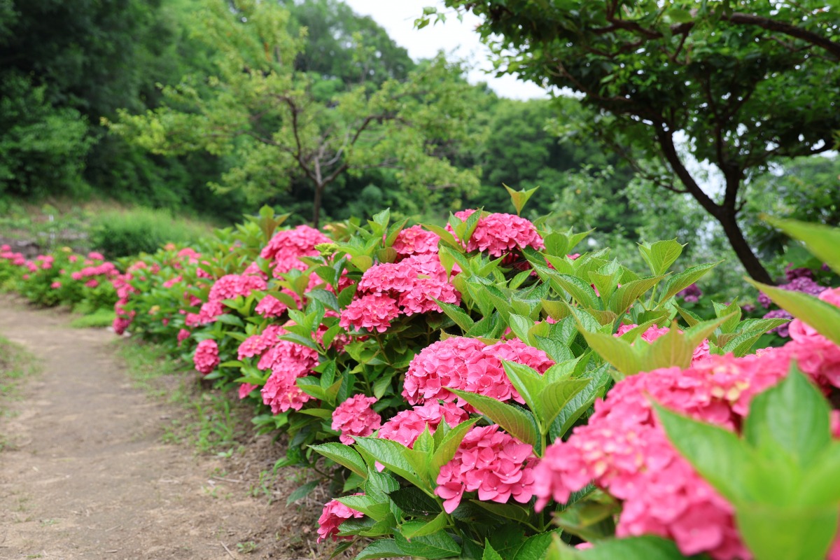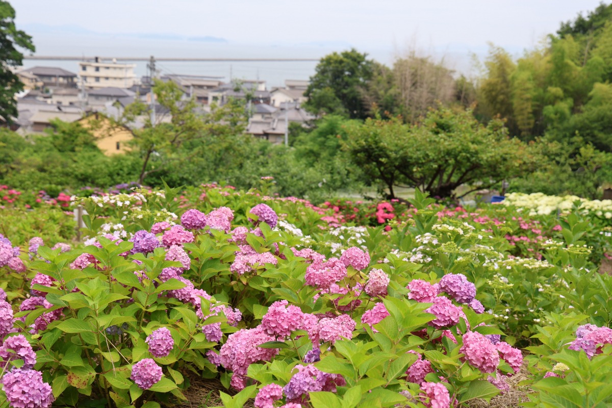 山の斜面に咲くあじさいが、海と共に楽しめると人気上昇中のスポットが浅口市寄島町にあります。6月半ばに訪れると、瀬戸内海を背景に鮮やかなピンクやブルーの7種類のあじさいが見頃を迎えていました!近隣には海を眺められるカフェもあり、ドライブにもおすすめです。