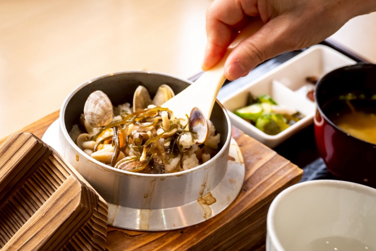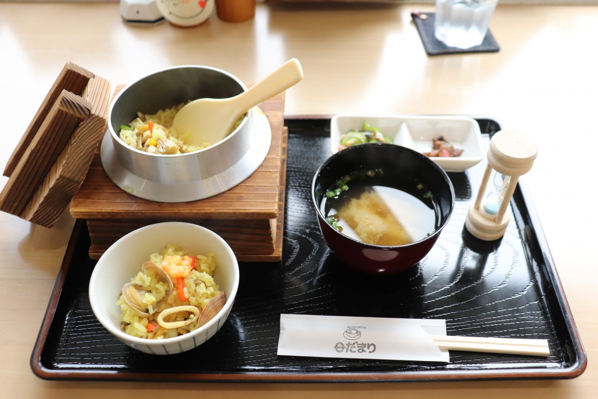 友人と一緒だったので、二人でシェアして「あさり釜めし」(1,300円)も頂きました!磯の香たっぷりで、あさり、ホタテ、エビと共に昆布もたっぷり入っていてお出汁が効いていました。窯のふたを開けると磯の香りの湯気が立ち食欲をそそりました(湯気を撮ろうと友人との共同作業で撮りましたが撮影は難しかったです…)。ランチには、コーヒーマシーンでワンドリンクサービスがつくので嬉しい限りでした!暑い日だったのでアイスコーヒーにしました。