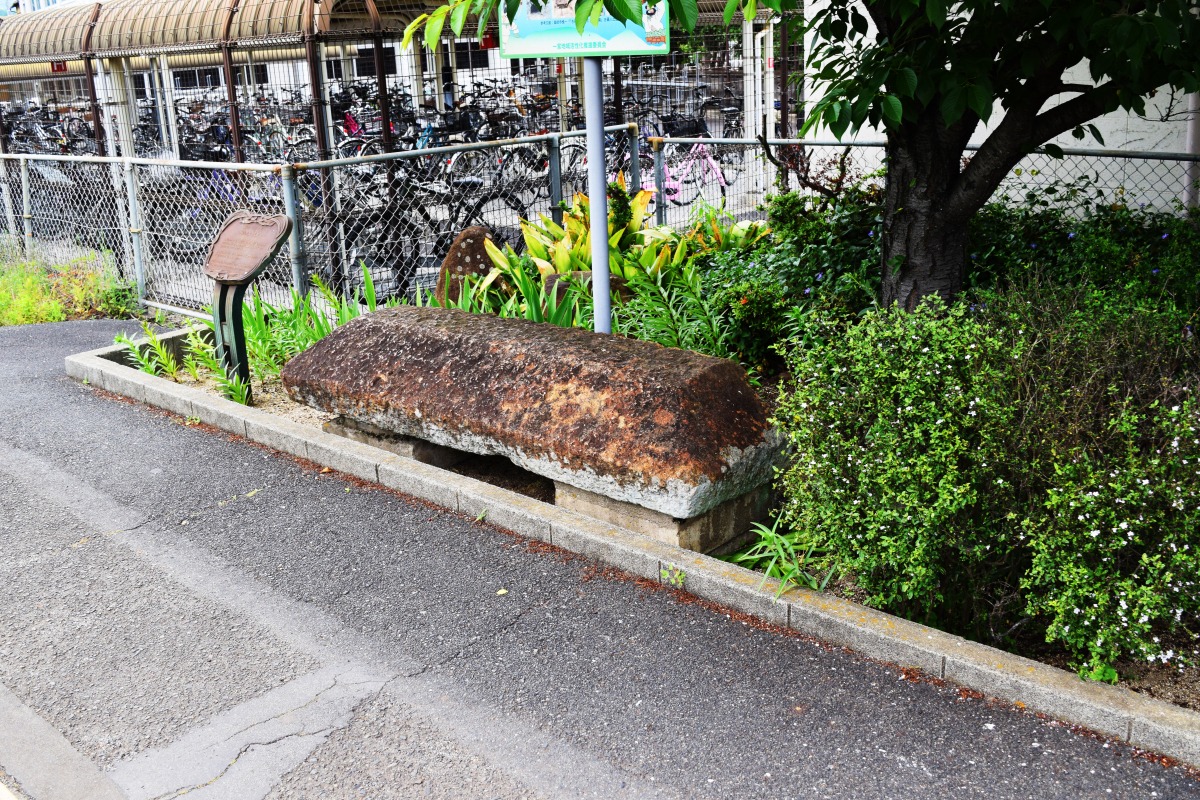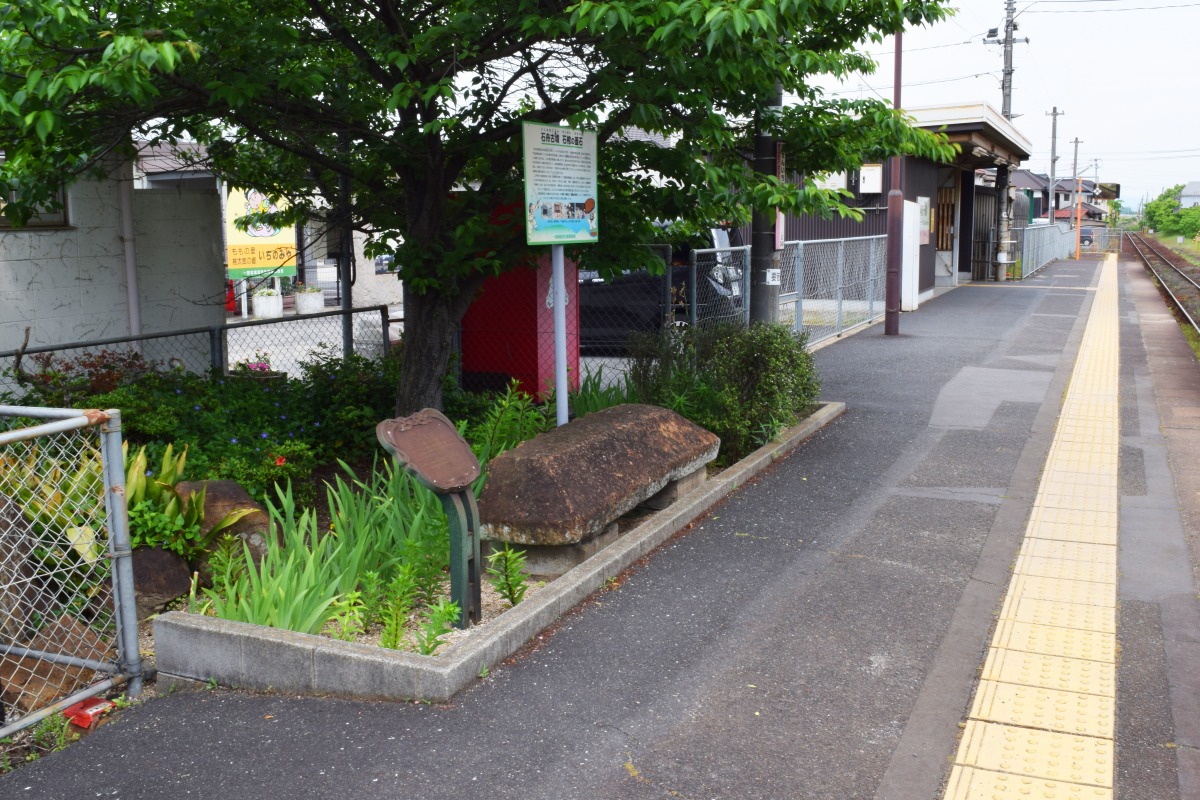 まずは、駅のホームに半分に割られた石棺の蓋が置いてあるという、なかなかクセの強いスポットをご紹介します。