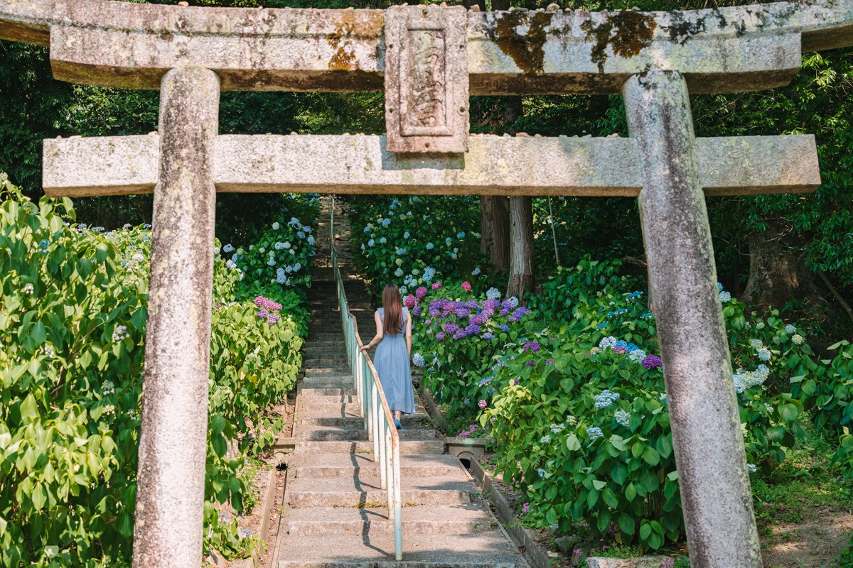 「吉備津神社」は、アジサイの名所としても親しまれています。アジサイ園は、先ほどご紹介した廻廊の中央付近、2つのベンチが設置されている場所の東側にあります。特に、鳥居から伸びる階段の脇を彩るアジサイは、神聖な趣と相まって格別の美しさです。日本の梅雨の季節にしか見られない、神社ならではの情景を楽しめる場所ですよ。