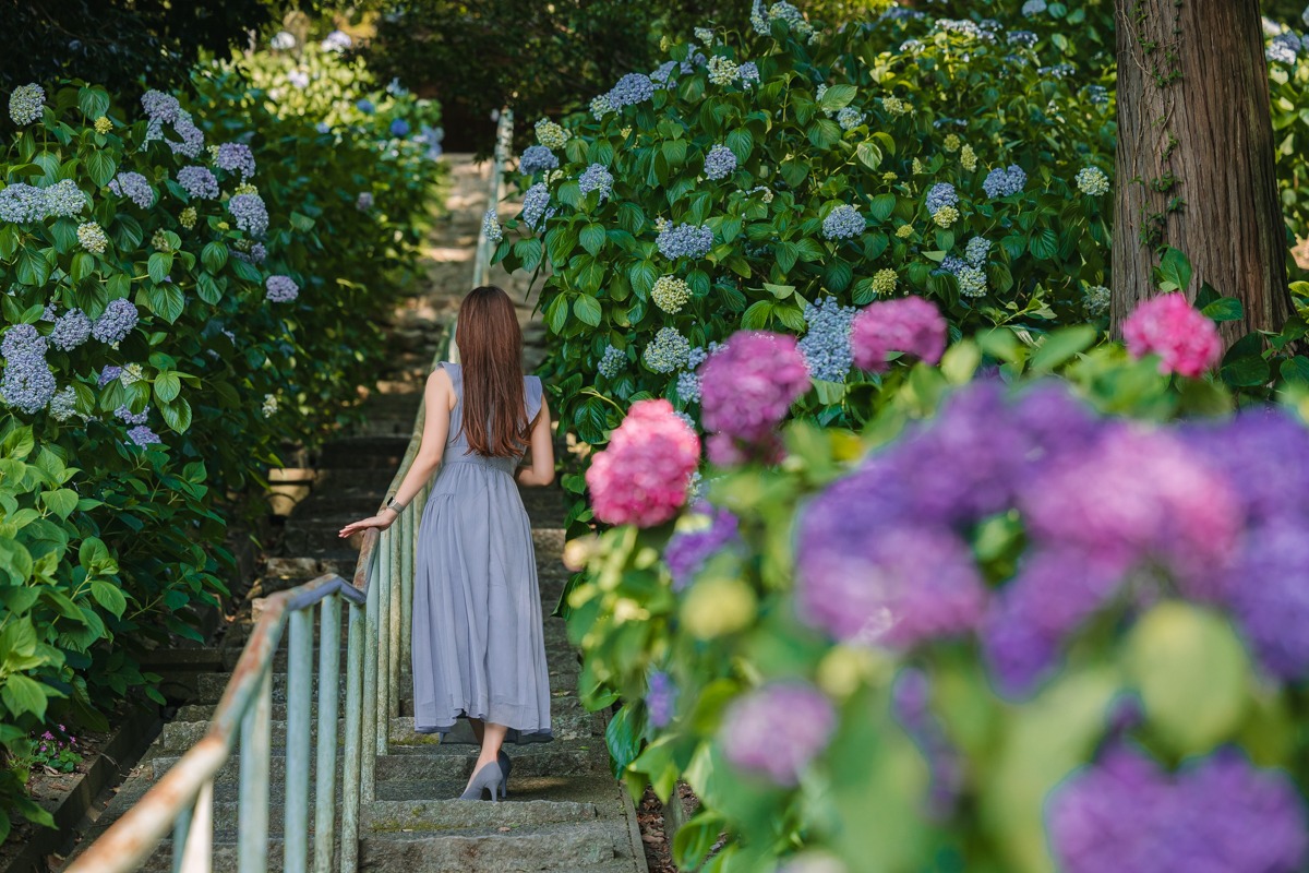 こちらは、脇道から階段方面に向かって撮影したアジサイの様子です。美しいアジサイ園ですが、階段や道以外には立ち入らないよう、またアジサイを傷つけないようご協力をお願いします。撮影の際は、通行の邪魔にならないよう、そして他の方が映り込まないよう、周囲へのご配慮をお願いします。