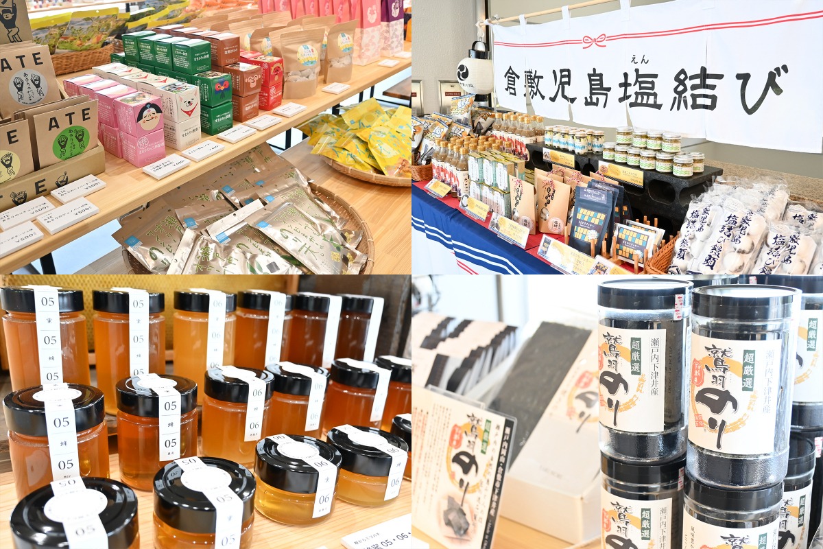 その4Fはショップスペース。児島エリアと倉敷はもちろん、岡山と瀬戸内が誇る土産品や特産品を揃えたセレクトショップです。定番の吉備団子などのお菓子や地酒をはじめ、「児島の塩」「鶏卵」「海苔」「はちみつ」など、多くの地場産品をセレクト。地元の“豊かさ”を持ち帰ることができる新しいスタイルのショップになっています。