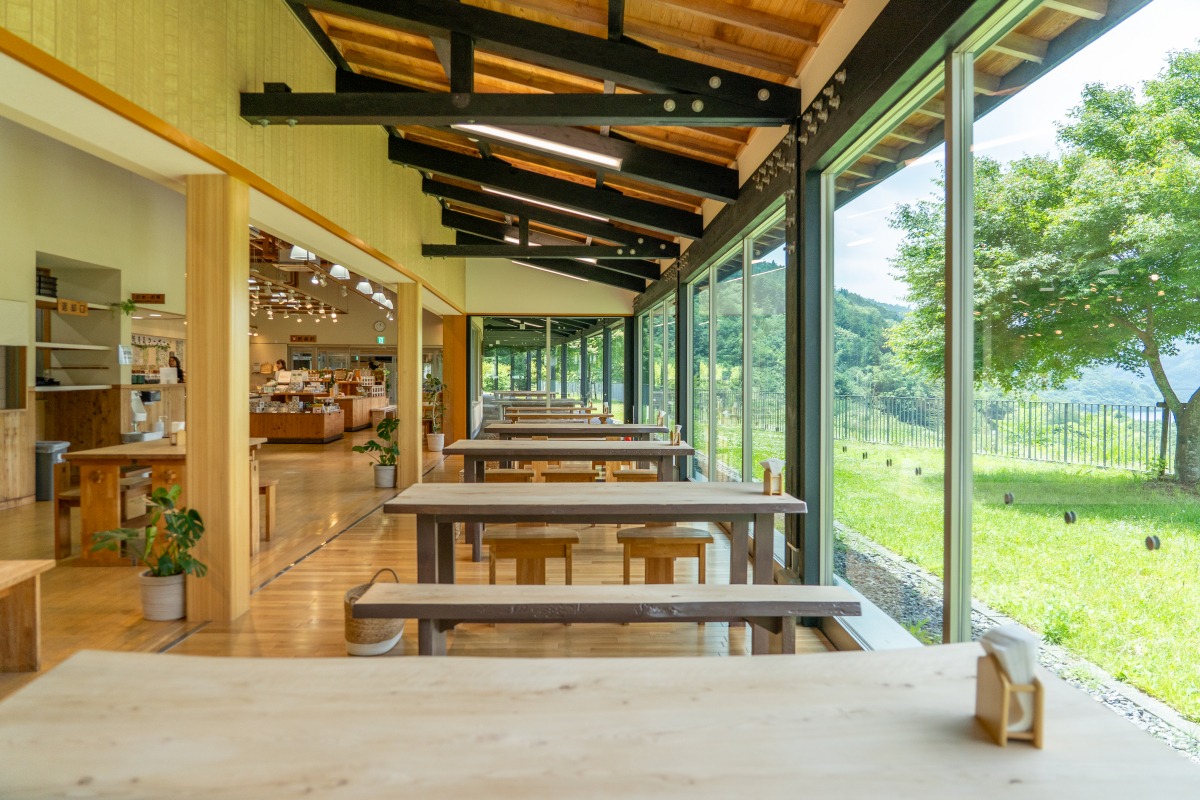 鏡野町をより堪能できる複合施設としてリニューアルした「みずの郷奥津湖ビジターセンター」。あわせて誕生したのが、地元食材を使ったメニューの提供や地域産品やお土産の販売などを行う「KAGAMINO Foods&Goods COHAN」です。こちらは鏡野町の恵みを食事や買い物で享受できる、新たな地産地消スポットです。
