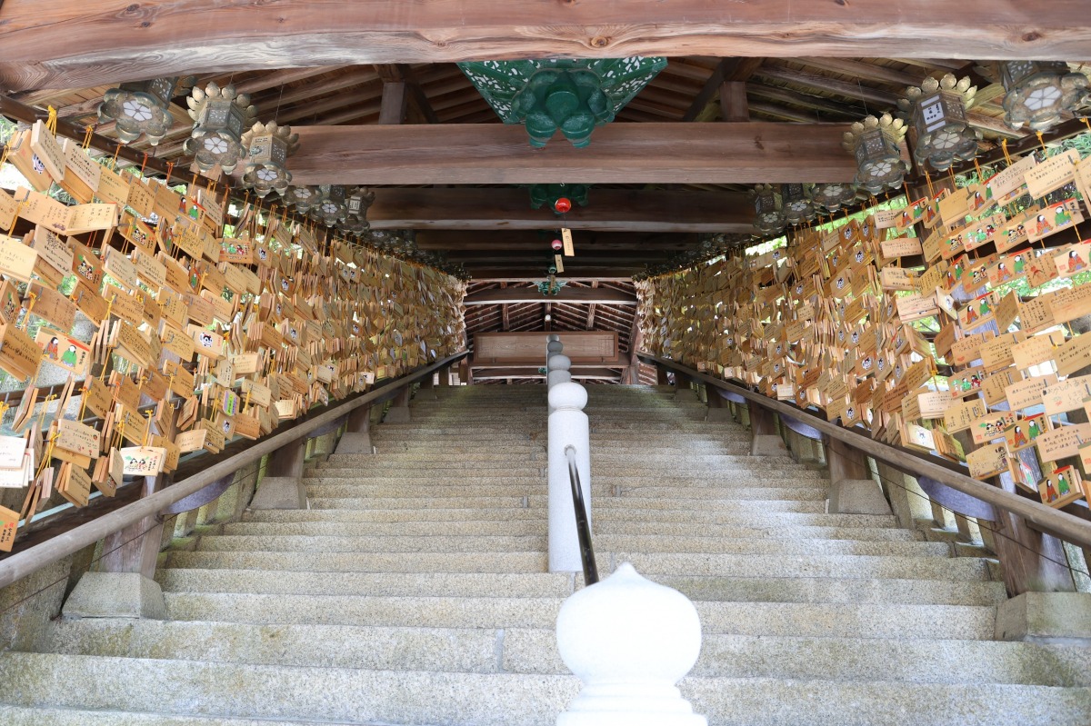本堂に向かう階段にはたくさんの絵馬が飾られています。圧巻の数で、階段を上るしんどさも忘れさせてくれます。天井には風鈴が飾られていて、暑さも和みました。
