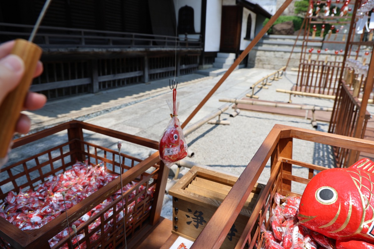 面白いおみくじがありました!その名も「一年安鯛みくじ」。子供の手のひらサイズの赤と金のかわいい鯛を竿で釣るようになっています(500円)。鯛の尾におみくじが入っています。私も釣ってみました。