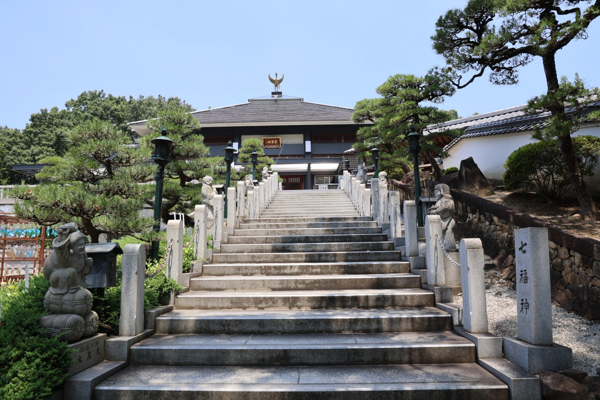 祈祷をする紫雲殿(祈祷所)までの階段には七福神たちが並んでいます。ニコニコ顔の布袋尊様(和合の神)、弁財天様(智恵の神)、毘沙門天様(勇気の神)、恵比須様(律儀の神)、大黒天様(裕福の神)、福禄寿様(大望の神)、寿老人様(長寿の神)です。