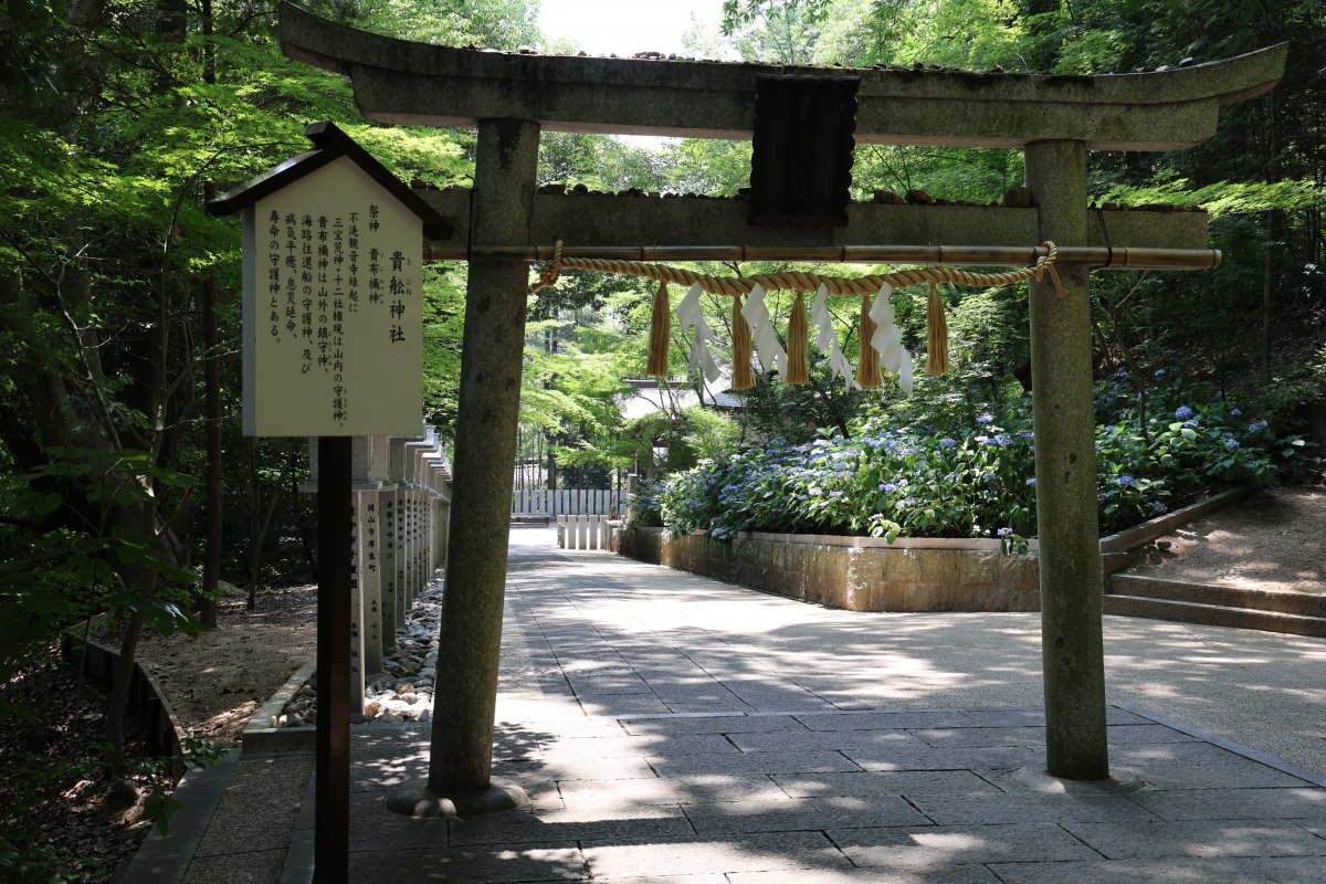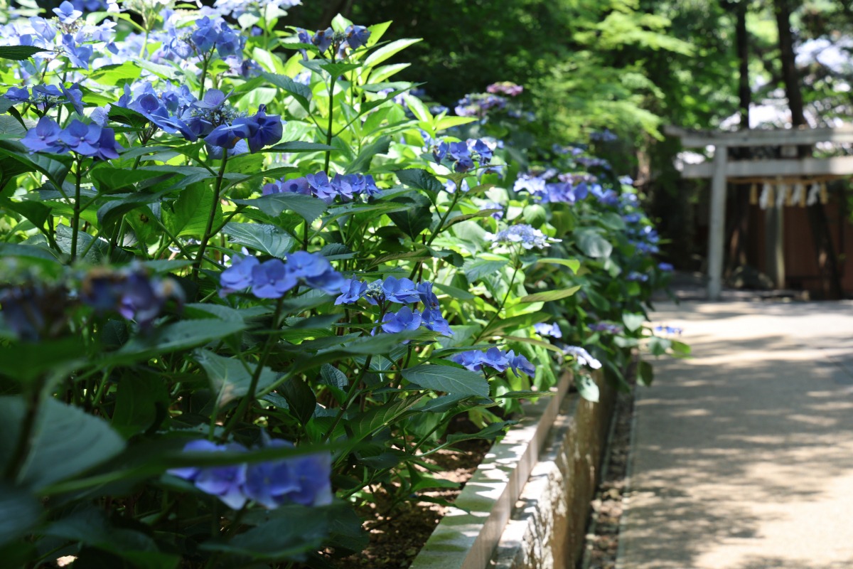「不洗観音寺」から「貴舩神社」本堂までの参道には、ブルーのガクアジサイがきれいでした(2025年6月28日撮影)。静かで落ち着いた雰囲気の神社です。