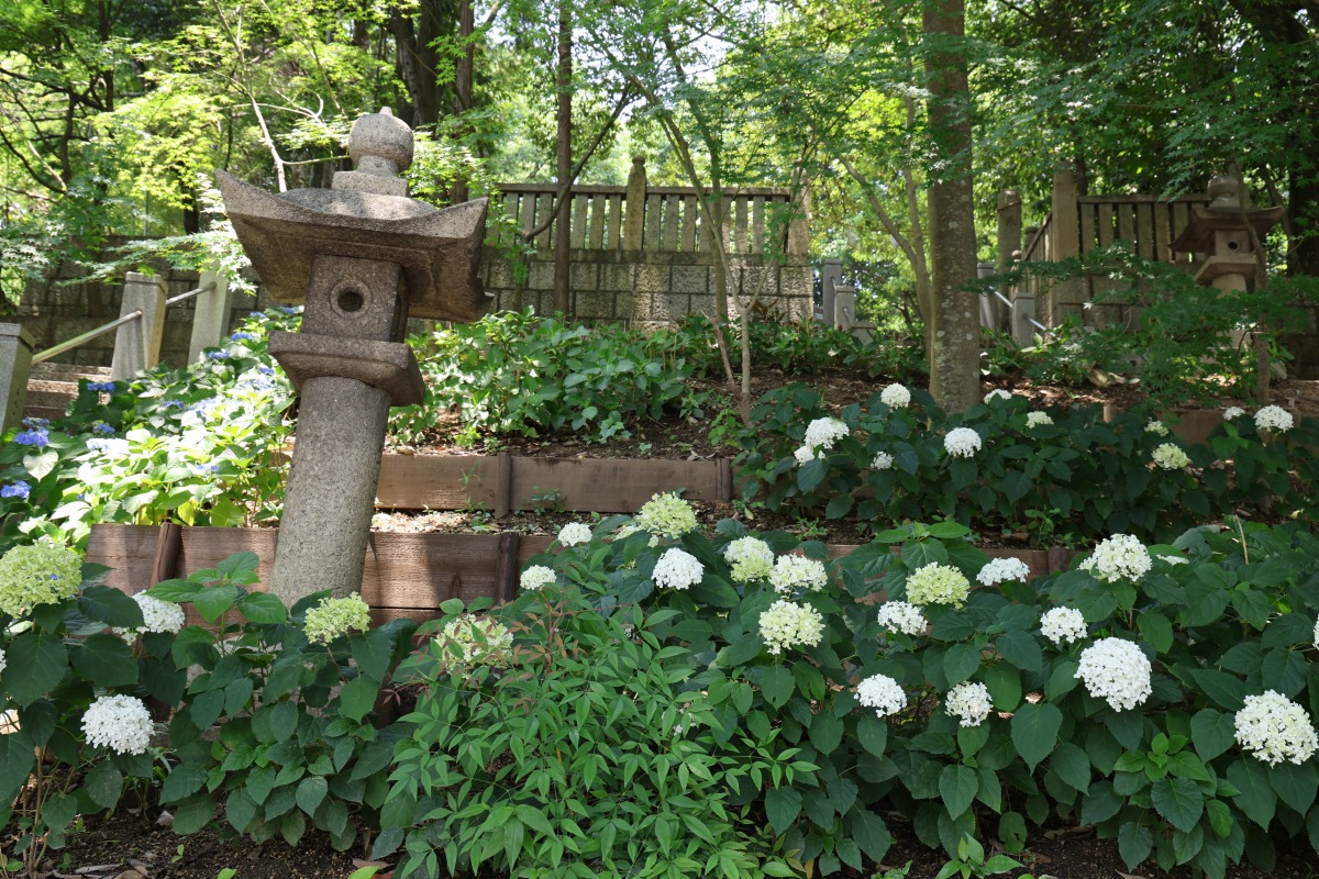 住宅街からの山門には、お百度石もあり、近隣地域の方から守り神として信仰されてきた様子が伺えました。山門入り口には、あじさいのアナベルがたくさん咲いていてきれいでした。