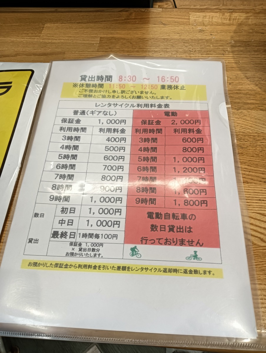 普通自転車/1,000円(最低金額400円。そこから1時間ごとに100円加算)