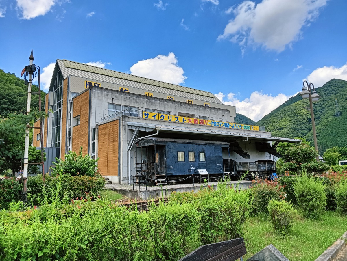 湯郷温泉街から約13km、約1時間の行程。片道ロマン街道サイクリングロードの終点である「柵原ふれあい鉱山公園」。
