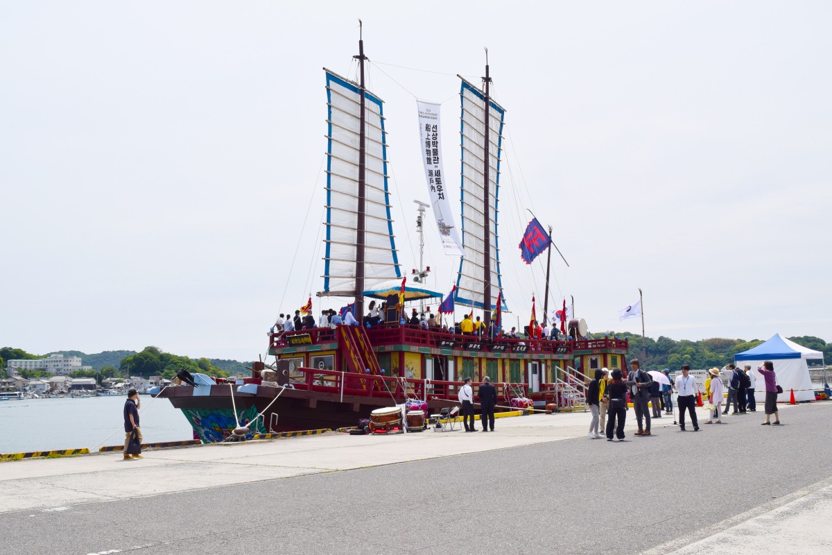 上の写真は2025年5月に、日韓国交正常化60周年を記念して、韓国の釜山から大阪万博へやってきた「朝鮮通信使」の復元船が牛窓に寄港した際のものです。