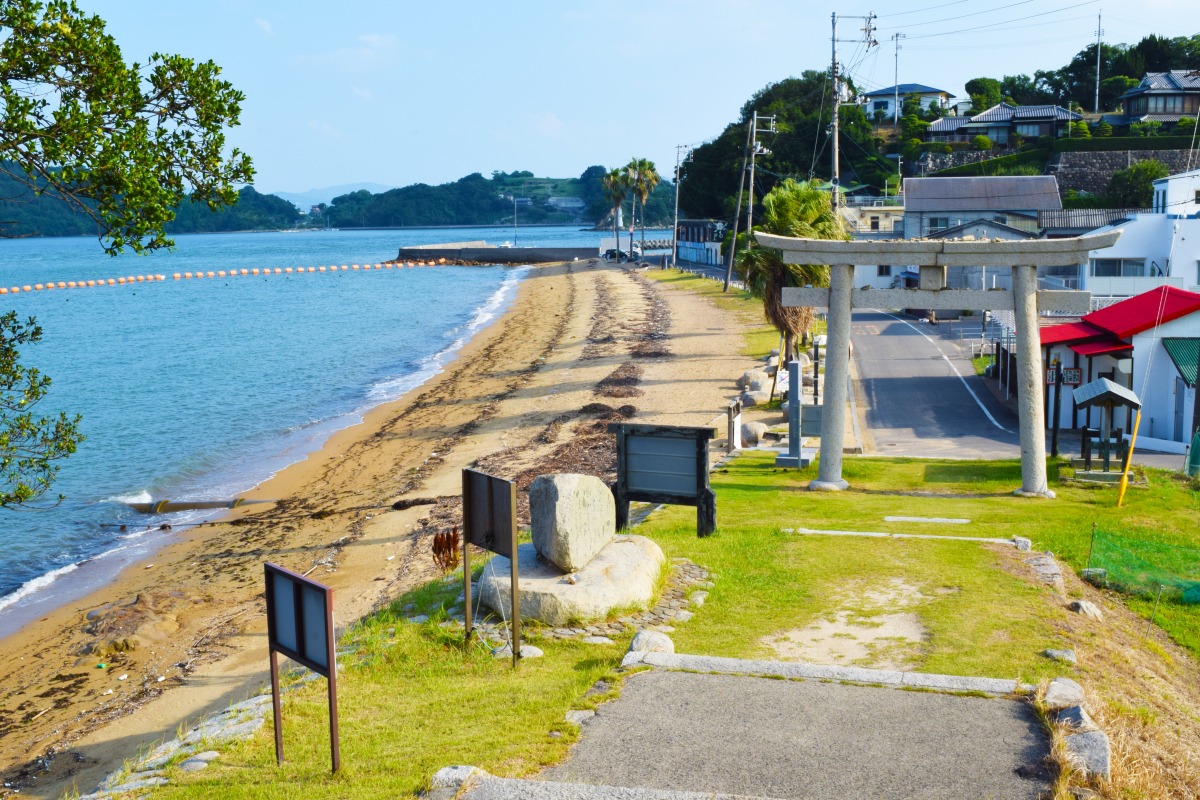 「神功皇后」が遠征のため船で九州へ向かう途中、この地で牛鬼という怪物に襲われた際に、住吉明神が現れて牛鬼を投げ倒して退治した「牛転び(うしまろび)」が転訛したのが「牛窓」の由来とされています。