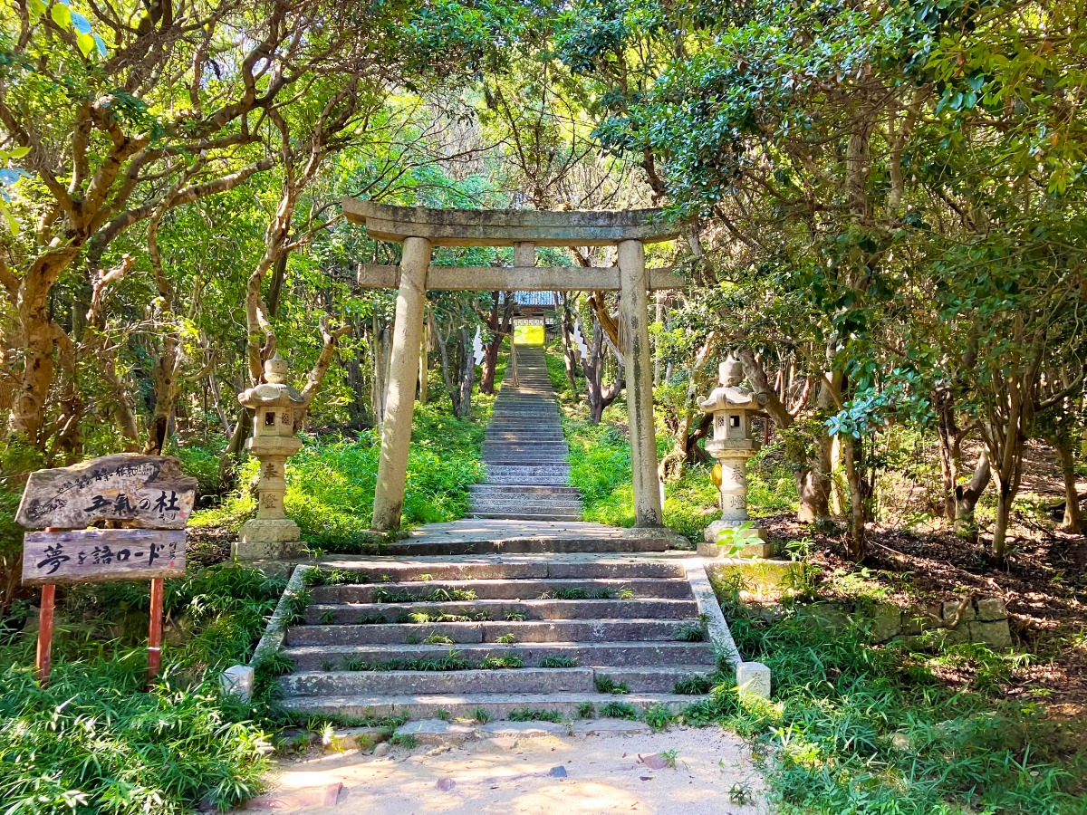 「望洋亭」を過ぎてさらに進むと、ようやく二の鳥居と、奥に随神門が見えてきます。この石段を上りきった先に本殿があります。足腰に自信のない方は、鳥居とは反対方向(北側)から車で本殿の少し手前まで上ることができます。
