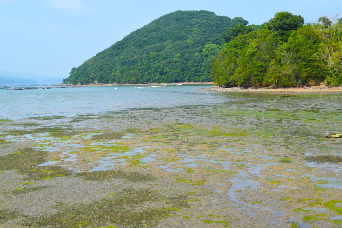 「牛窓神社」からもう少し北へ足を延ばすと「師楽(しらく)」という名前の小さな入り江があります。このあたりには自然のままの海岸線が残されていて、干潮時には写真のような干潟が姿を現します。原初の牛窓の風景はこんな感じだったのではという想像が膨らみます。「師楽」は「新羅」の転訛だという伝承もあるそうなので、潮待ち港というだけではなく、大陸への玄関口、国際港だった名残かもしれません。