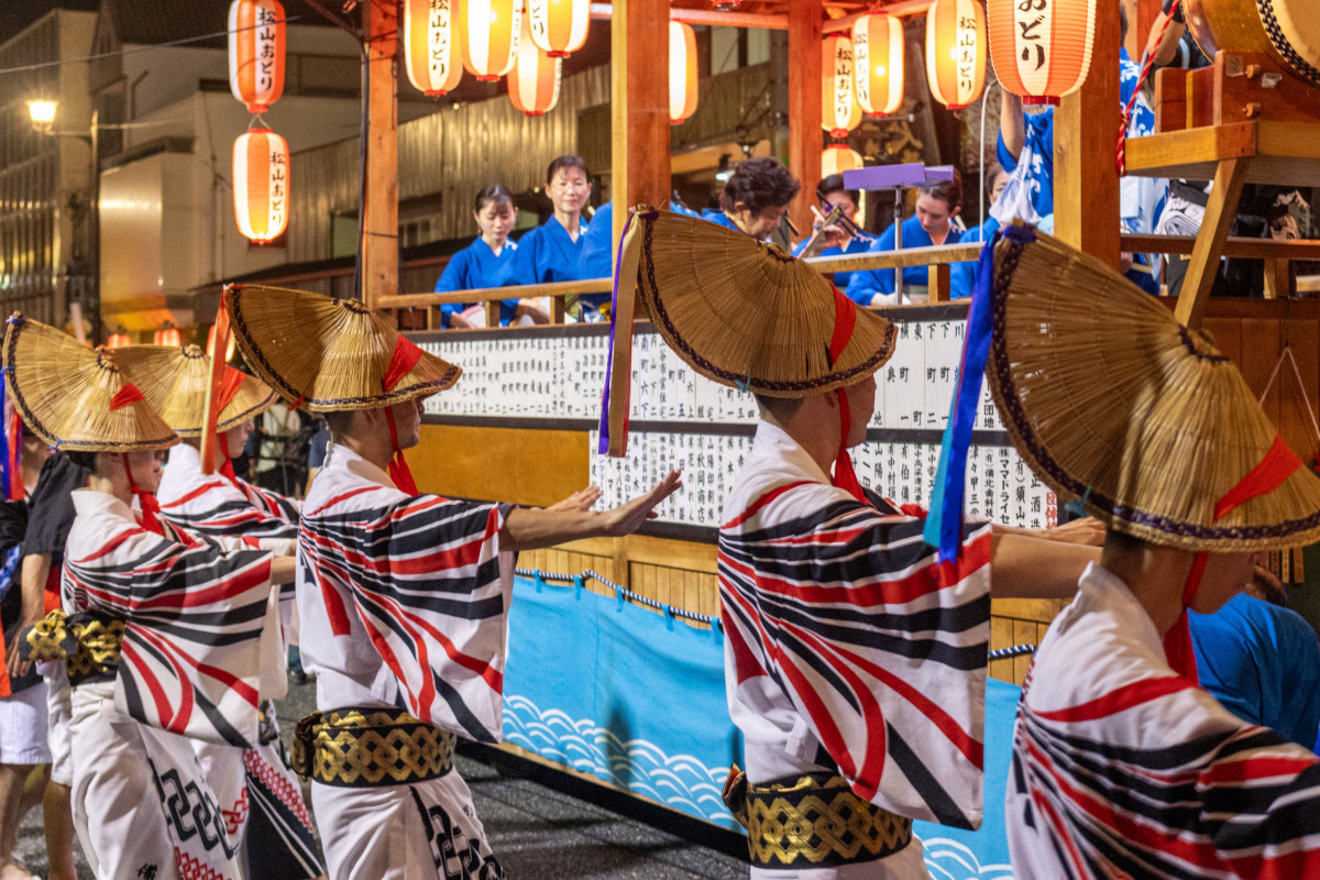 以来、踊り継がれること370有余年。「松山踊り(地踊り)」、「ヤトサ踊り」、「仕組(しぐみ)踊り」と、3種類の踊りが伝えられていて、松山踊り(地踊り)とヤトサ踊りはだれでも踊りの輪に参加することができます。