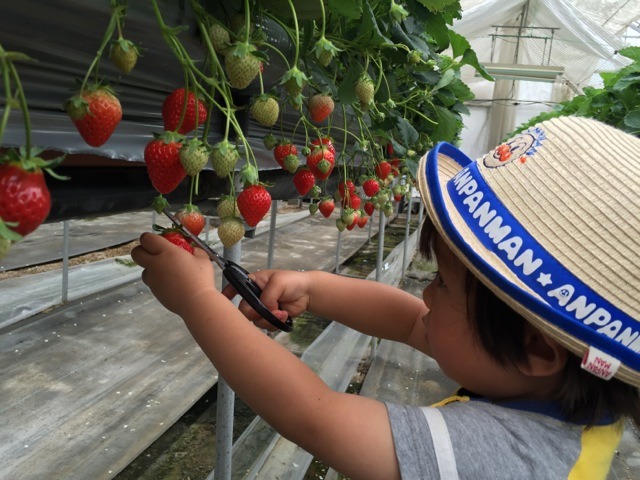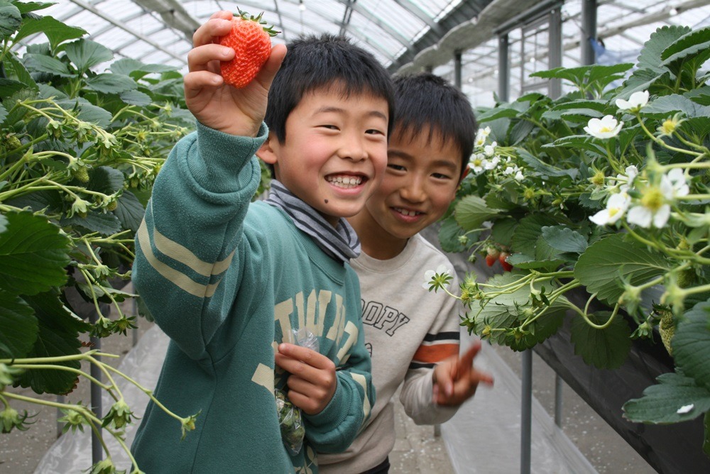 吉井川の地下水を使って育てられた、「とよなか」「さちのか」「あきひめ」「紅ほっぺ」「さがほのか」「アスカルビー」など、6種類のいちごが時間無制限で楽しめます。1mほどの高さの高設栽培で、ちょうど子どもの目線になるため親子連れに人気です。