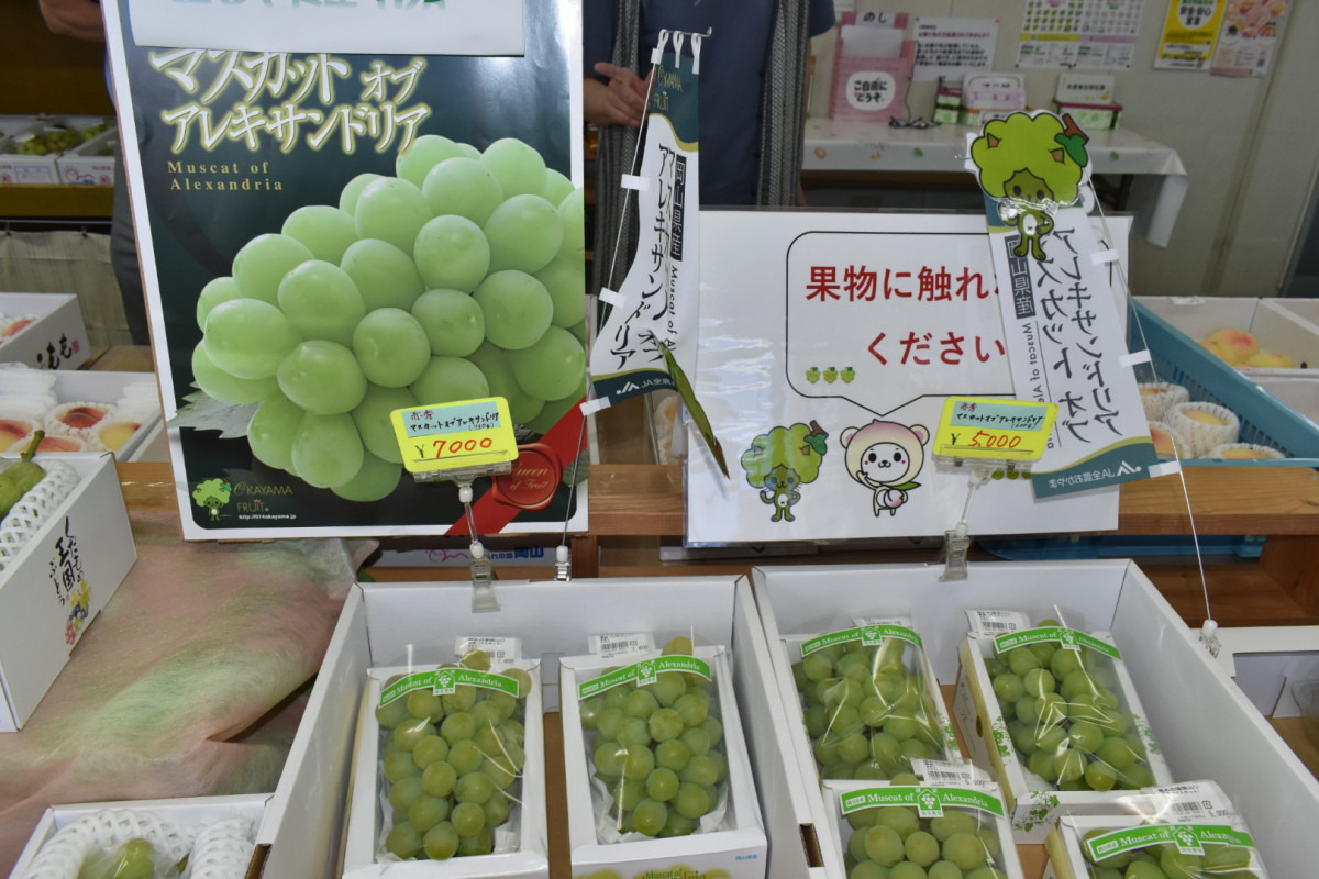 「JA晴れの国岡山」の直売所です。すぐ隣に船穂地区のJAの出荷場があり、農家から届く朝採れの新鮮なぶどうが大阪や東京などの卸売市場に送られています。6月上旬~11月までマスカット・オブ・アレキサンドリア、シャインマスカット、ピオーネを中心に、瀬戸ジャイアンツやオーロラブラック等の人気品種他、めずらしい品種も並びます。