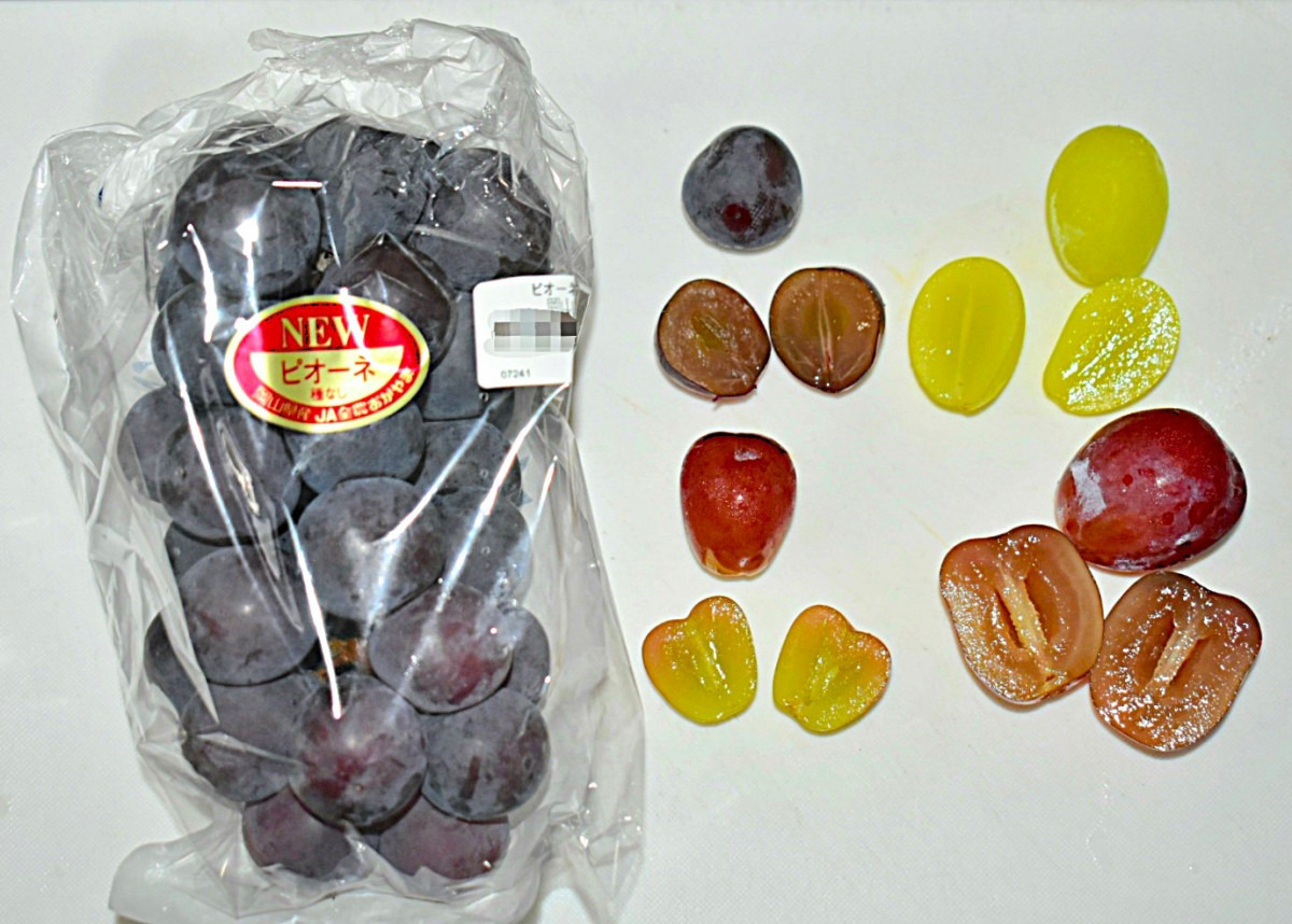 最近主流になってきている種無しぶどう。 ぶどうの種をなくし大きく育てるためには、開花時期にマイシン処理(確実な無核化)とジベレリン処理(肥大化)という作業が必要になります。この作業を逃すと大粒の種無しぶどうにならないので、農家さんにとっては大変忙しく重要な時期です。写真は種無しぶどうの品種のニューピオーネ、シャインマスカット、マイハート、ブラックシャイン。