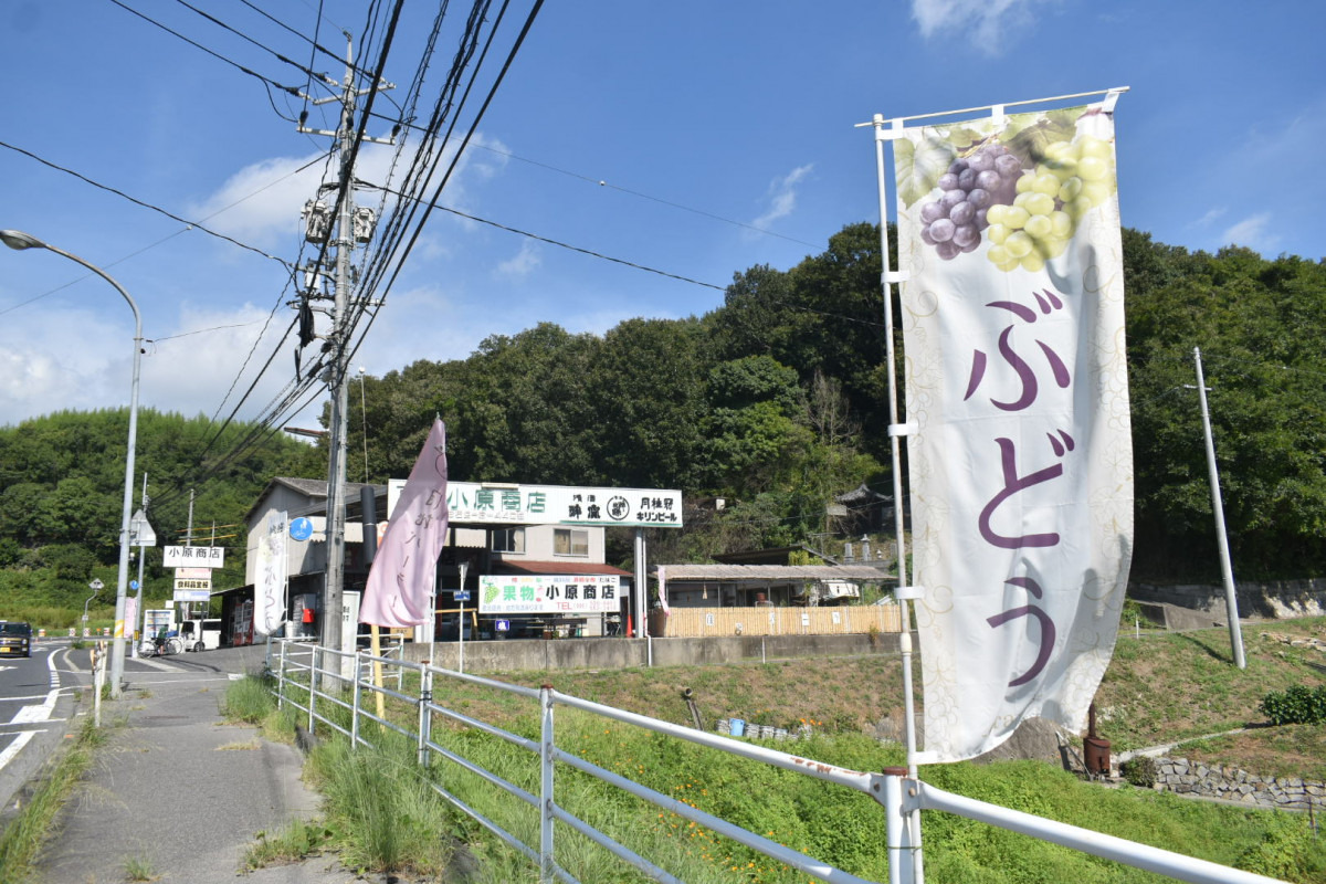 桃の産地でも有名な玉島冨田地区にあるぶどう農園の隣にお店があります。店から見ると畑に鈴なりに実ったぶどうが見えます。シャインマスカットが中心で、2026年からはマイハートなどの品種も販売予定。