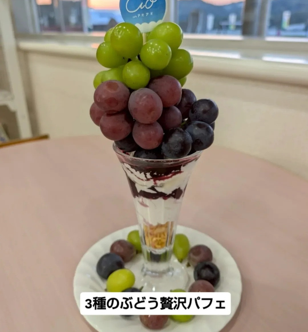 葡萄浪漫館の館内にある「cafe aoao」では、「3種のぶどう贅沢パフェ」が大人気。新鮮なぶどうをふんだんに使った写真映え間違いなしのフルーツパフェです。(写真は葡萄浪漫館提供)
